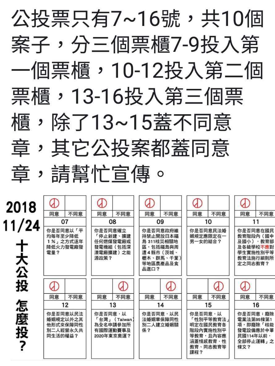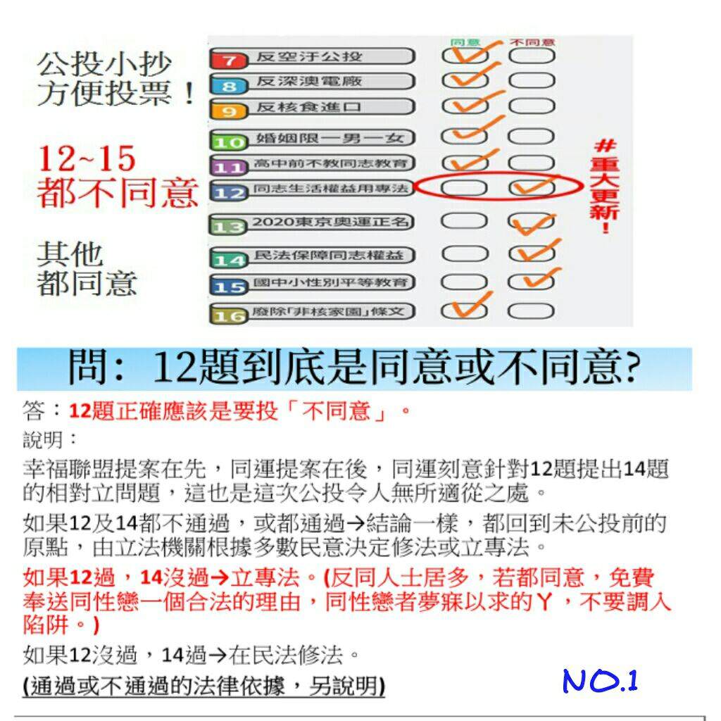 當挺同團體說「都是 LINE 上流傳的投票指南讓老人亂投」時,有想過自己不也做過這些「投票指南」── 要大家在非我(14, 15,有時候還會綁 13)之外「全部投下不同意」嗎?這個行為不也跟 LINE 上流傳的投票指南差不多嗎?那在雙方都有「公投指南」的情況下批判另外一邊只會看小抄投、沒民主素質、閱讀測驗零分、老人不意外,不就是五十步笑百步嗎?