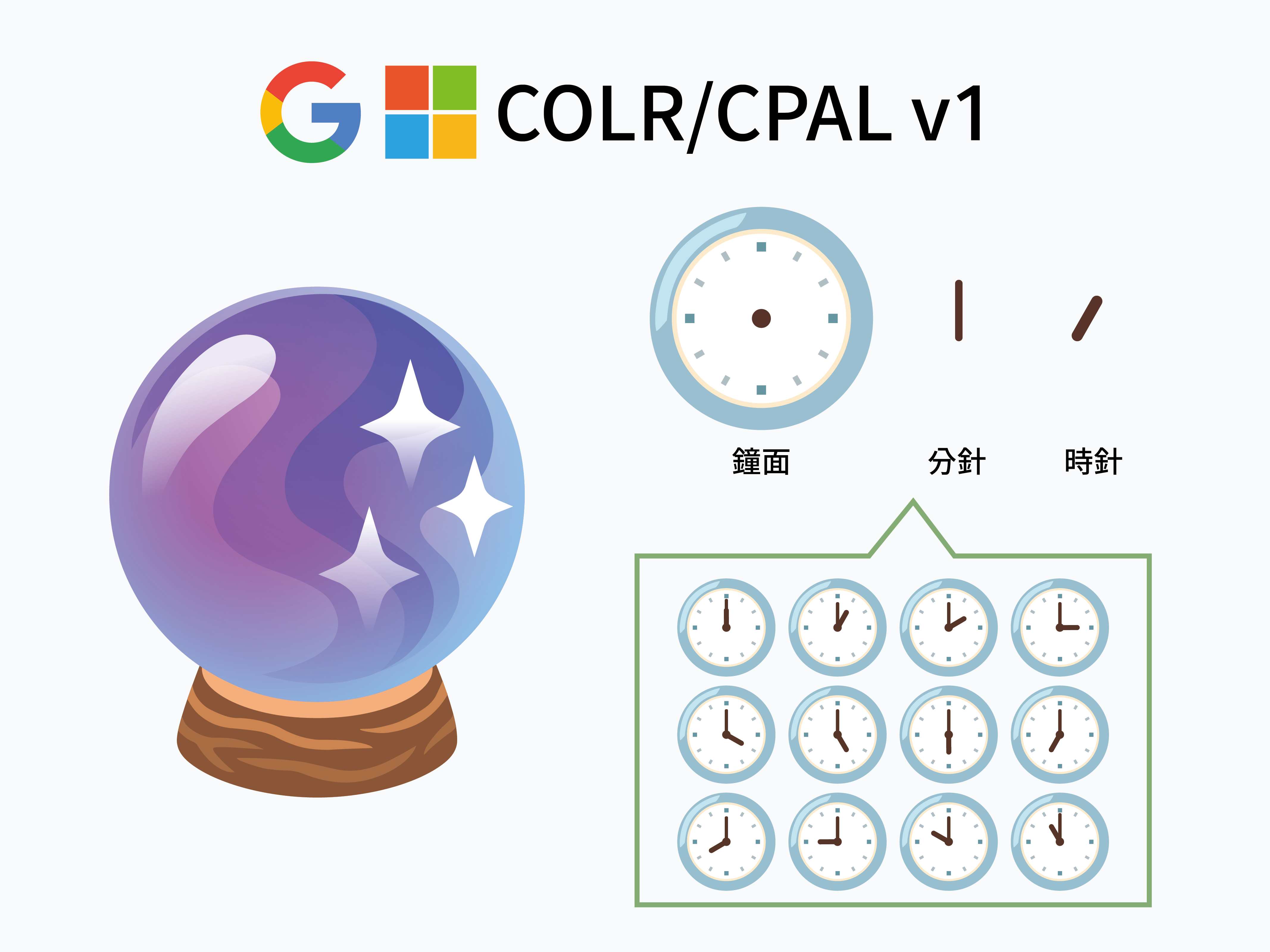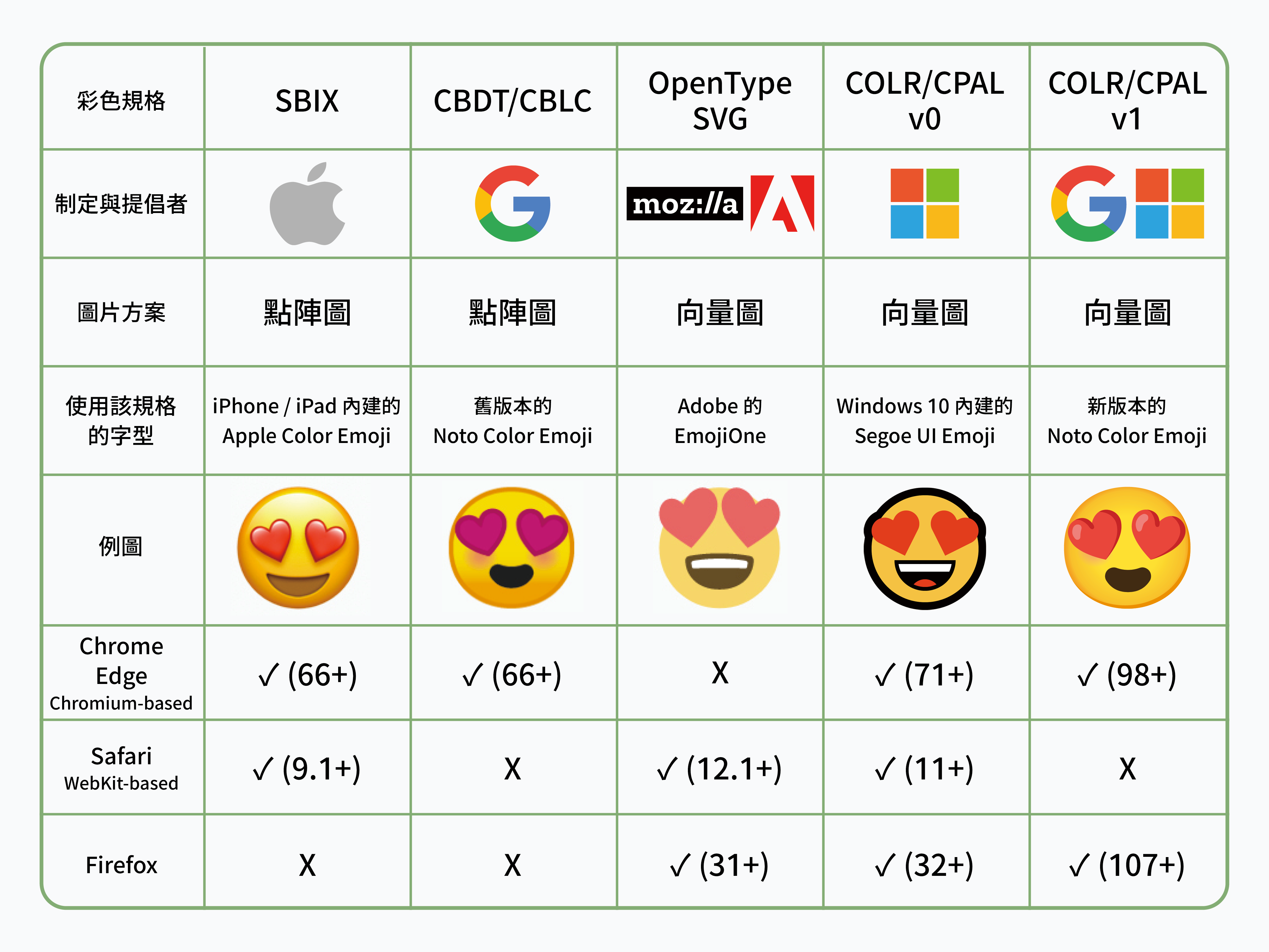 近期,或許 Google 也深感向量字型才是未來,逐步棄用自己的 CBDT/CBLC,選擇和 Microsoft 聯手,基於原本的 COLR/CPAL 格式,擴充出 COLR/CPAL v1 規格(原本的則被稱作 v0)。