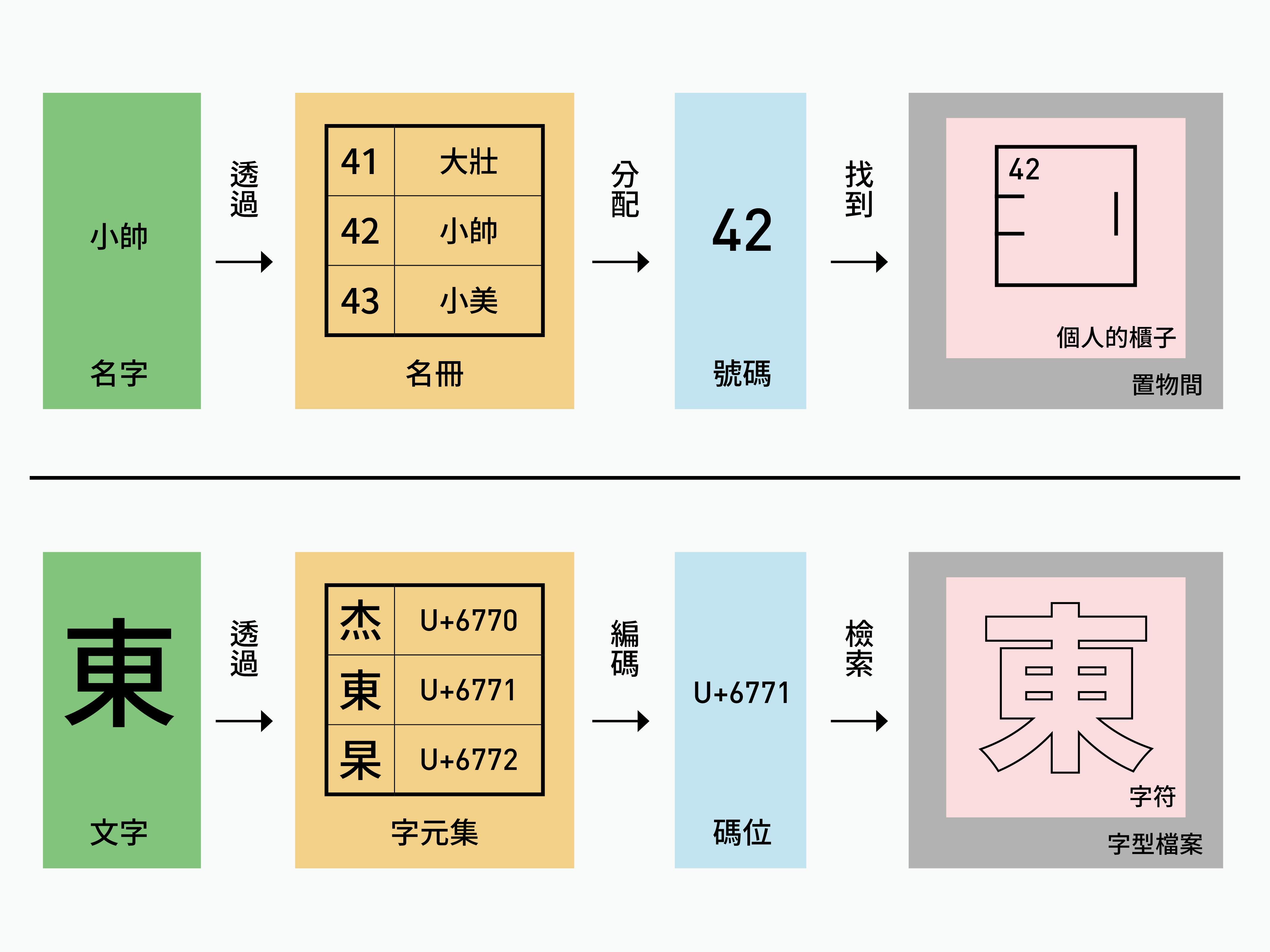 同樣地,碼位只是提供了字符的指向資訊,告訴電腦在存取時,可以在 U+6771 的位置上找到「東」。但碼位本身並沒有揭露字符應該要長什麼樣子,必須等電腦找到字符之後,才能獲取「東」的輪廓外觀。