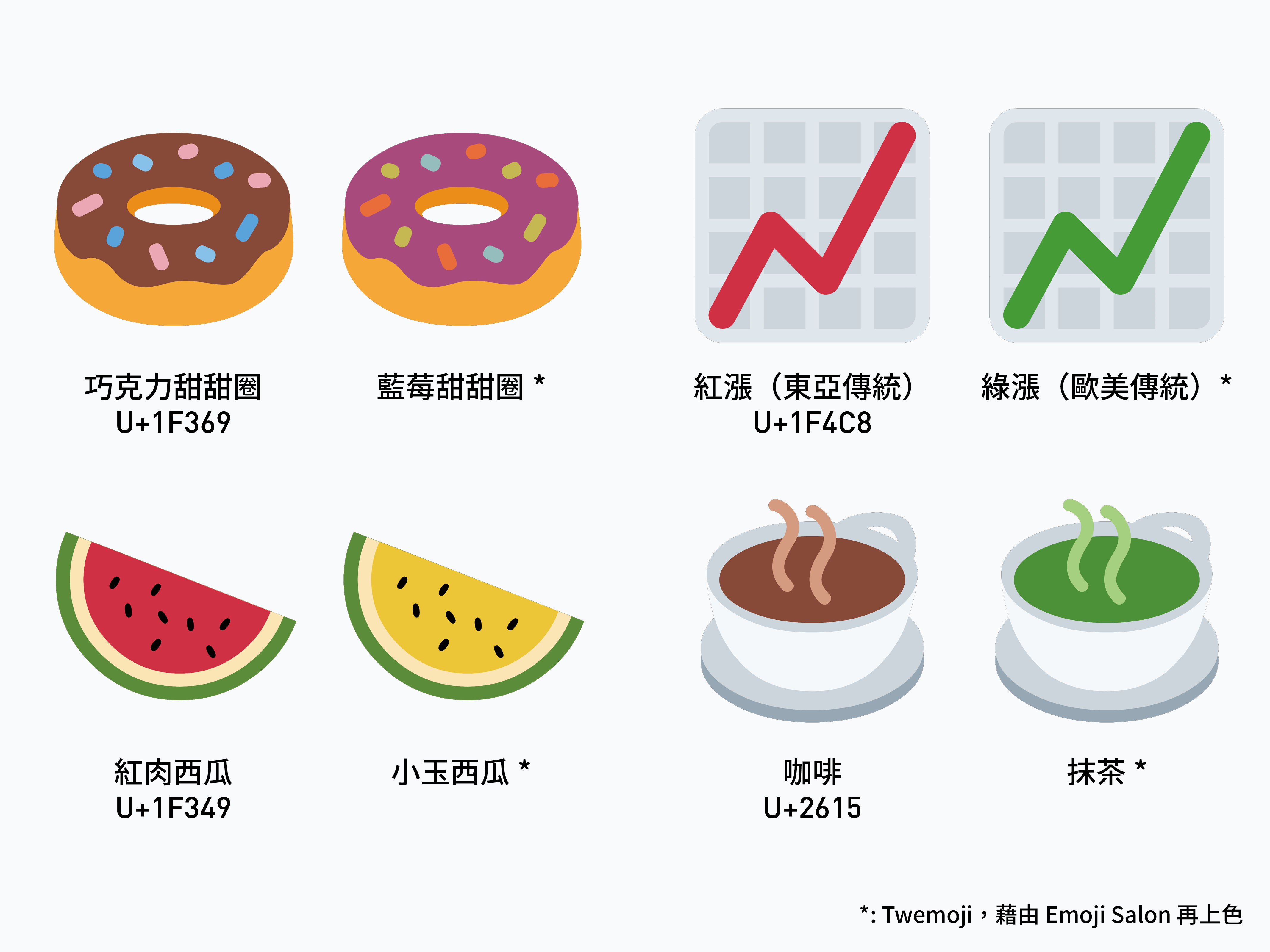 舉例來説,西瓜 🍉 (U+1F349),在多數的字型裡都是設計成紅肉西瓜,我們也可以填入黃色,將其改造成小玉西瓜;熱飲 ☕️ (U+2615) 則多被設計成咖啡的顏色,難道除了裝熱咖啡之外,就不能是熱牛奶、熱烏龍茶、熱抹茶嗎?