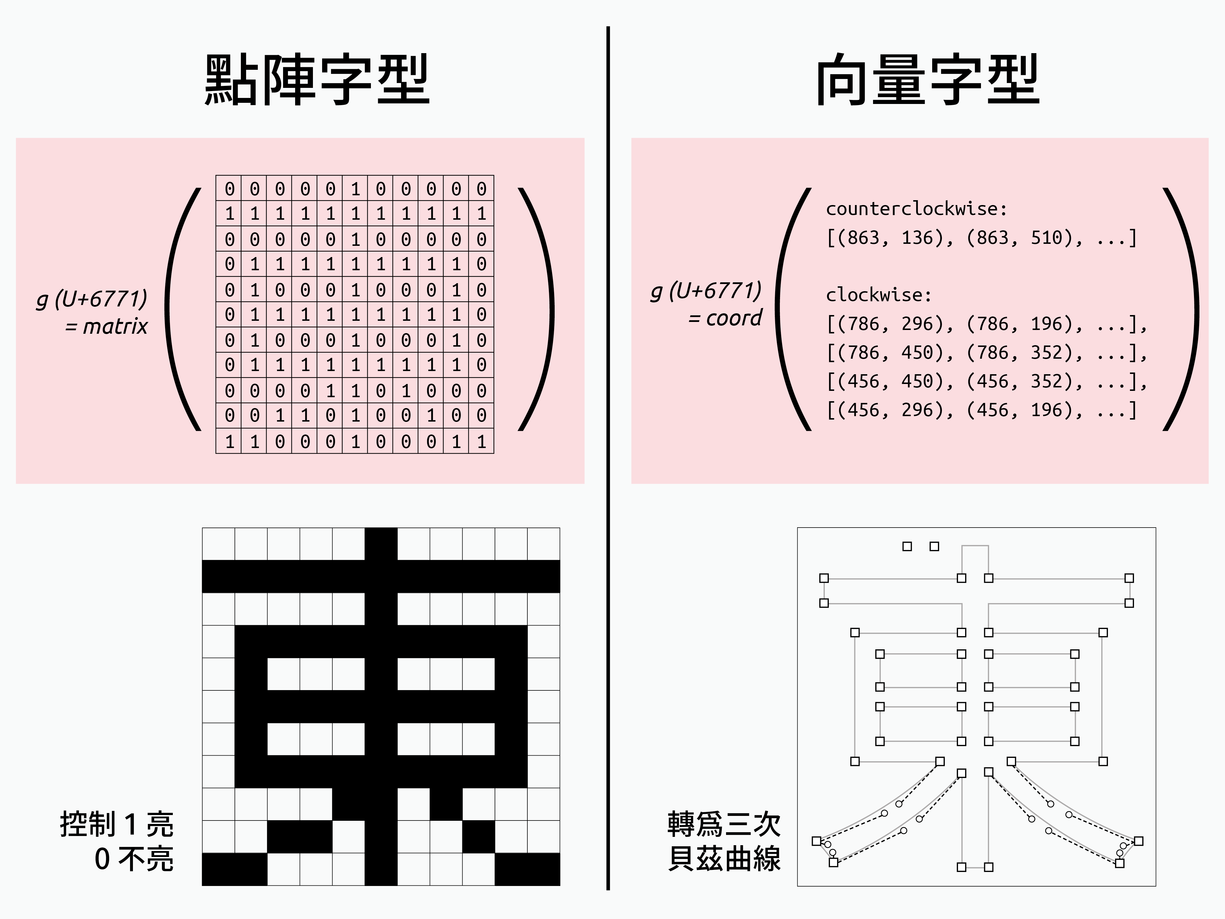 至於這個「輪廓外觀」要怎麼儲存呢?在數位字型概念剛誕生的時候,大多都以矩陣(matrix)的形式紀錄,藉由 1 與 0 來控制顯示器的亮與不亮。而現在的字型檔,則大多以向量(vector)的形式儲存,透過多個座標點和參數曲線來構建字的外觀。
