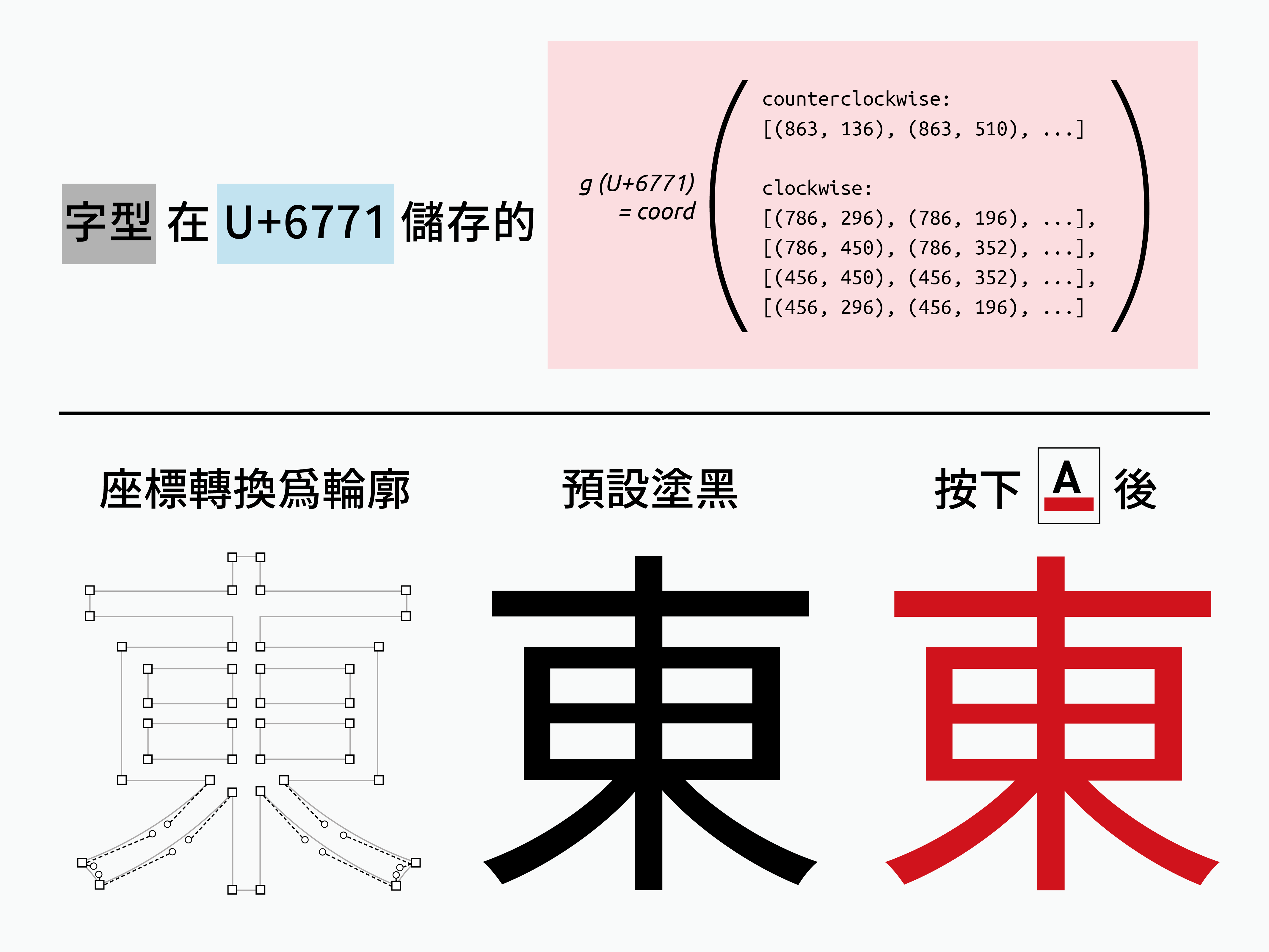 想要顯示彩色的字符,最直覺的想法就是在原本放路徑座標的櫃子裡,改成放一張圖片。如此一來,電腦還是能透過碼位,檢索字型檔案裡面的字符位置,只是這次找到的不是座標點,而是一張圖片。