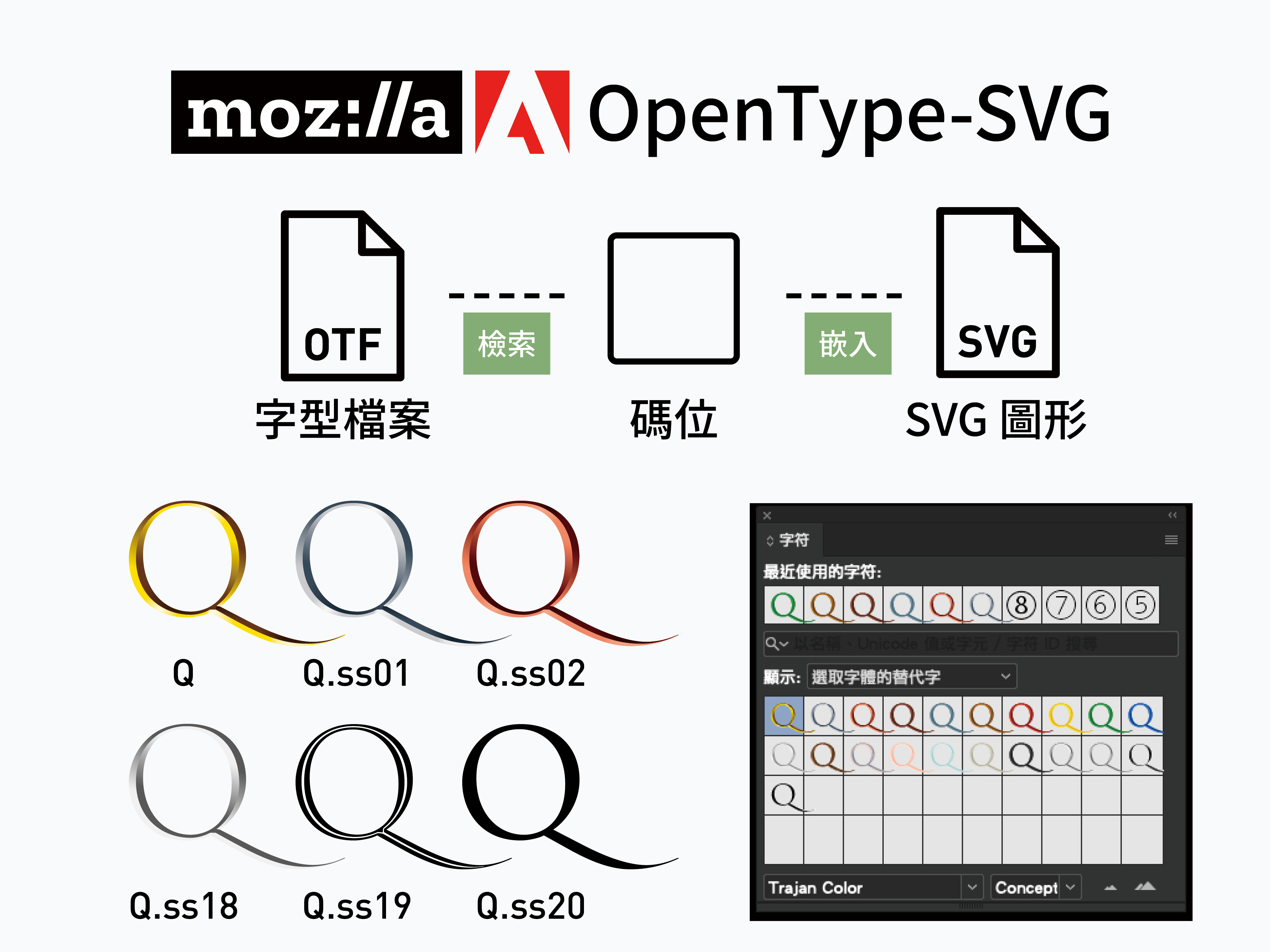 比較可惜的是,即使像是 Firefox 和 Safari 都支援 OpenType-SVG 規格的字型,但目前最主流的 Chrome 已經明確表示不會支援。因此,OpenType-SVG 的彩色字型,例如 Trajan Color,主要還是用在像是 Photoshop 或是 Illustrator 等 Adobe 桌面軟體上。