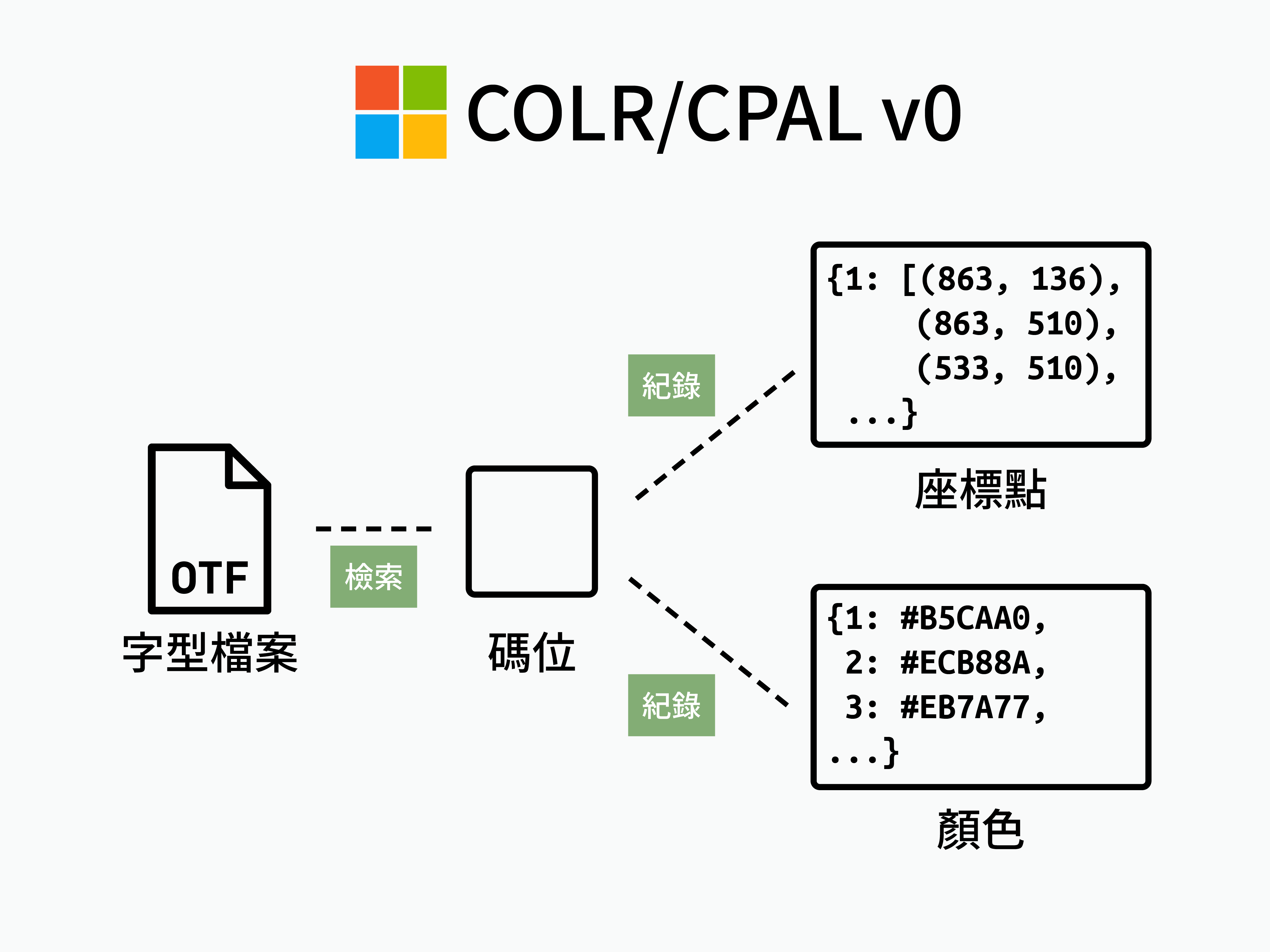 而 Microsoft 主導的 COLR/CPAL (Color / Color Palette) 技術則和上面所說的「塞圖」概念完全不同——既然字型檔已經儲存了封閉路徑,只要再另外紀錄各個路徑要顯示的顏色,就能在不額外嵌入圖片的情況下表現出色彩。
