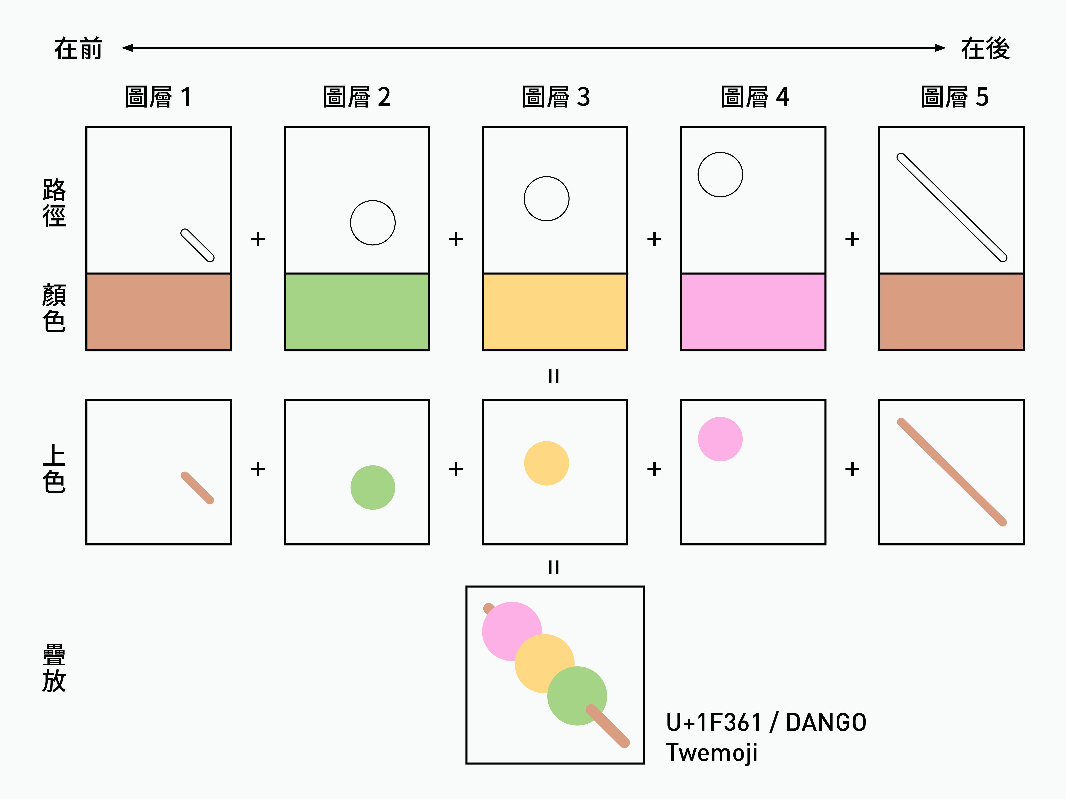 我們可以將設計好的字拆分成多個圖層,分別指定各個圖層要顯示的顏色,再按照圖層的順序疊放在一起。比起額外儲存一堆小圖片,現在檔案只要紀錄路徑和對應的色碼即可,能大幅減少檔案尺寸。
