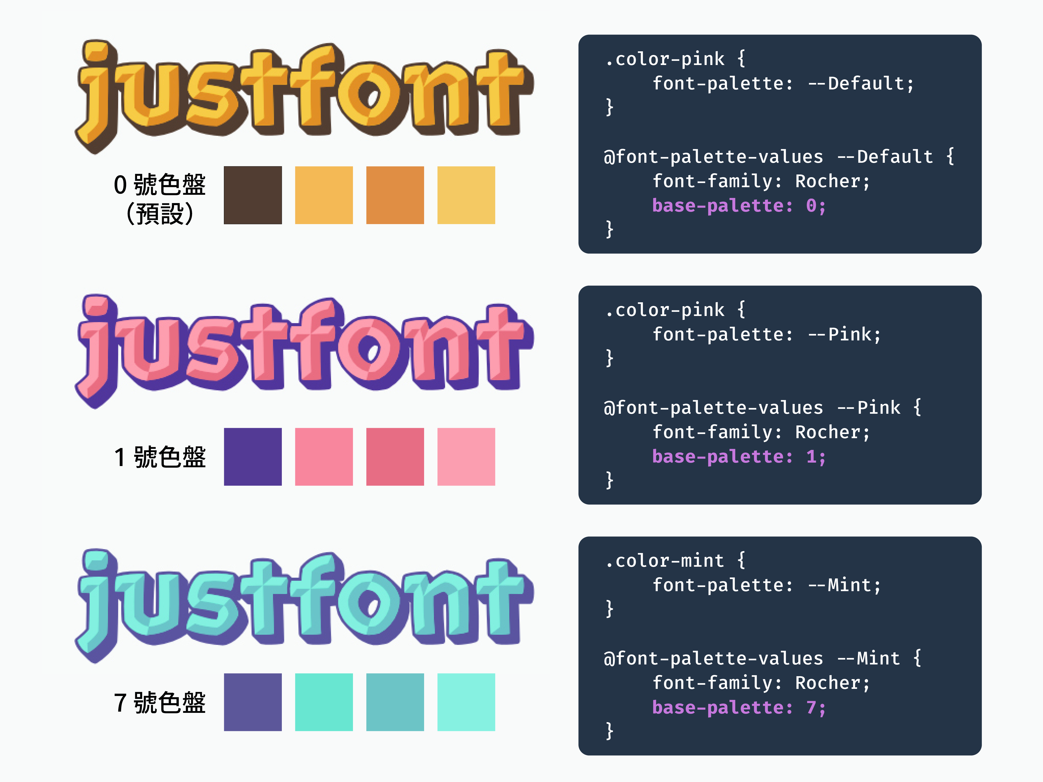 以 Rocher Color 這套字型為例,其內建了 11 個基本色盤。預設的顯示會使用的第 0 個色盤(橘棕配色),而使用者也可以透過 CSS 裡的 base-palette 屬性來指定某個色盤,例如用 base-palette: 1 指定第一個色盤(粉紅配色),或是 base-palette: 7 來指定第七個色盤(薄荷配色)。