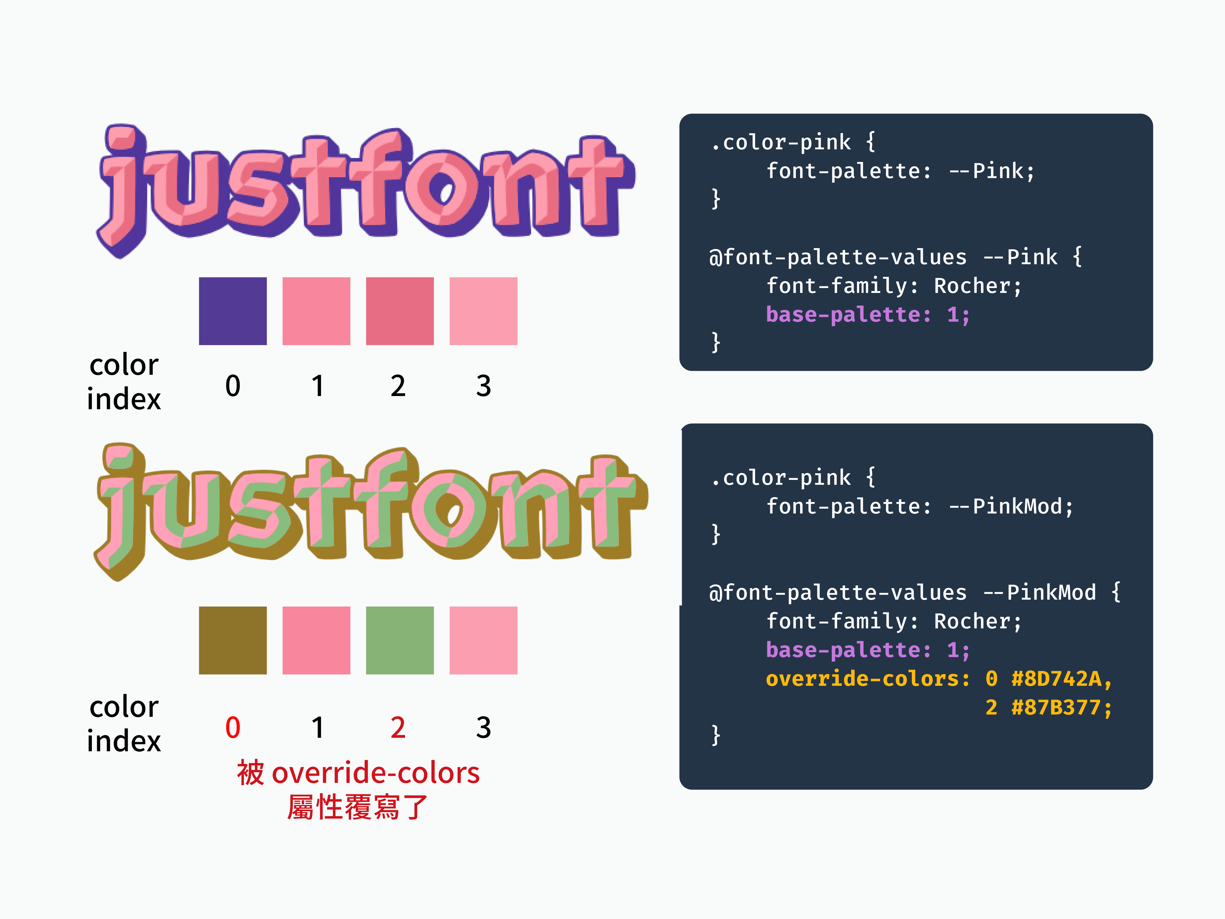 如果原本字型設計師的配色不符合我們的需求,我們可以針對某個色盤裡的某個顏色進行部分的覆寫,甚至全部都改成自定義的色票,這相當於將色彩的多樣性還給使用者,彈性更大。