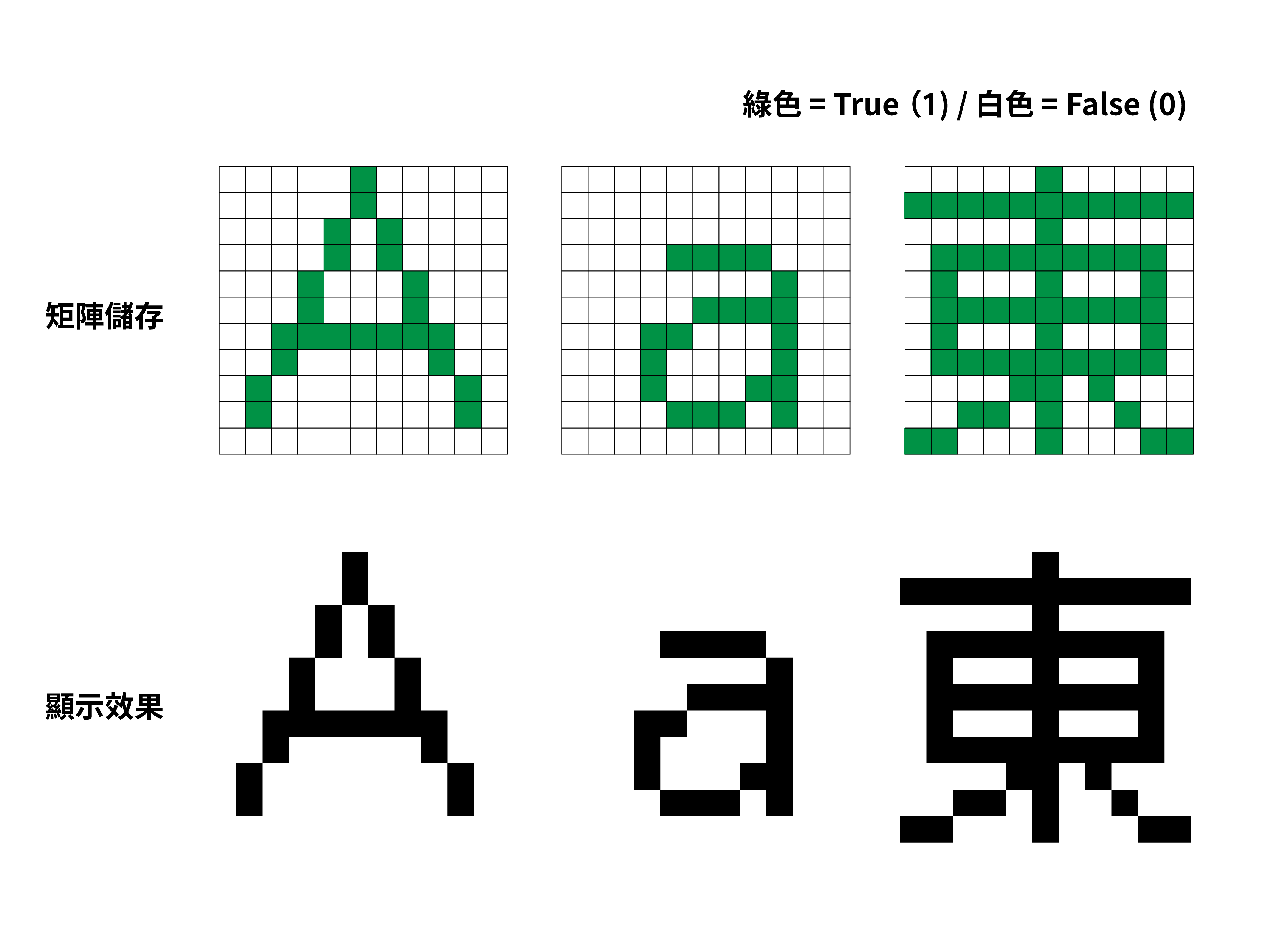 與現實字模裡的連續曲線不同,當時的顯示器分辨率極為有限,字符的輪廓多以矩陣的形式儲存,工程師在有限的網格空間內,將黑色需要顯示的部分被標示為 1、留白的部分則被標示為 0——以一個僅有 0 與 1 的矩陣紀錄,電腦再控制其像素(pixel)的顯示與否。