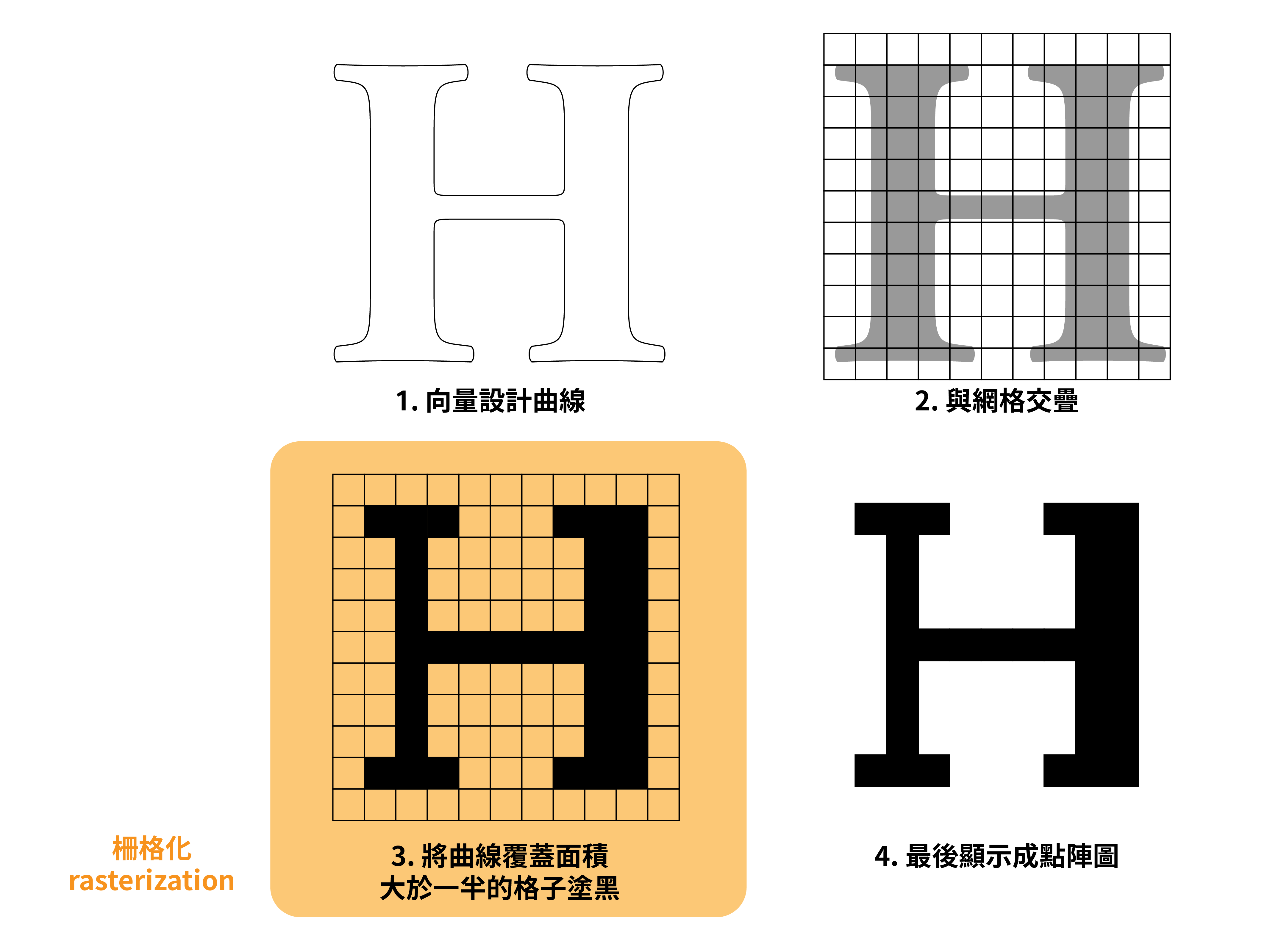 最簡單的方法就是將網格和曲線鋪在同一張紙上,如果曲線塗黑的部分(也就是字本身)超過一半面積以上,則將該格子塗黑;反之則留白,如此一來,所有的曲線就能透過柵格化(rasterization,或譯成光柵化)的方式轉成螢幕能顯示的格式。