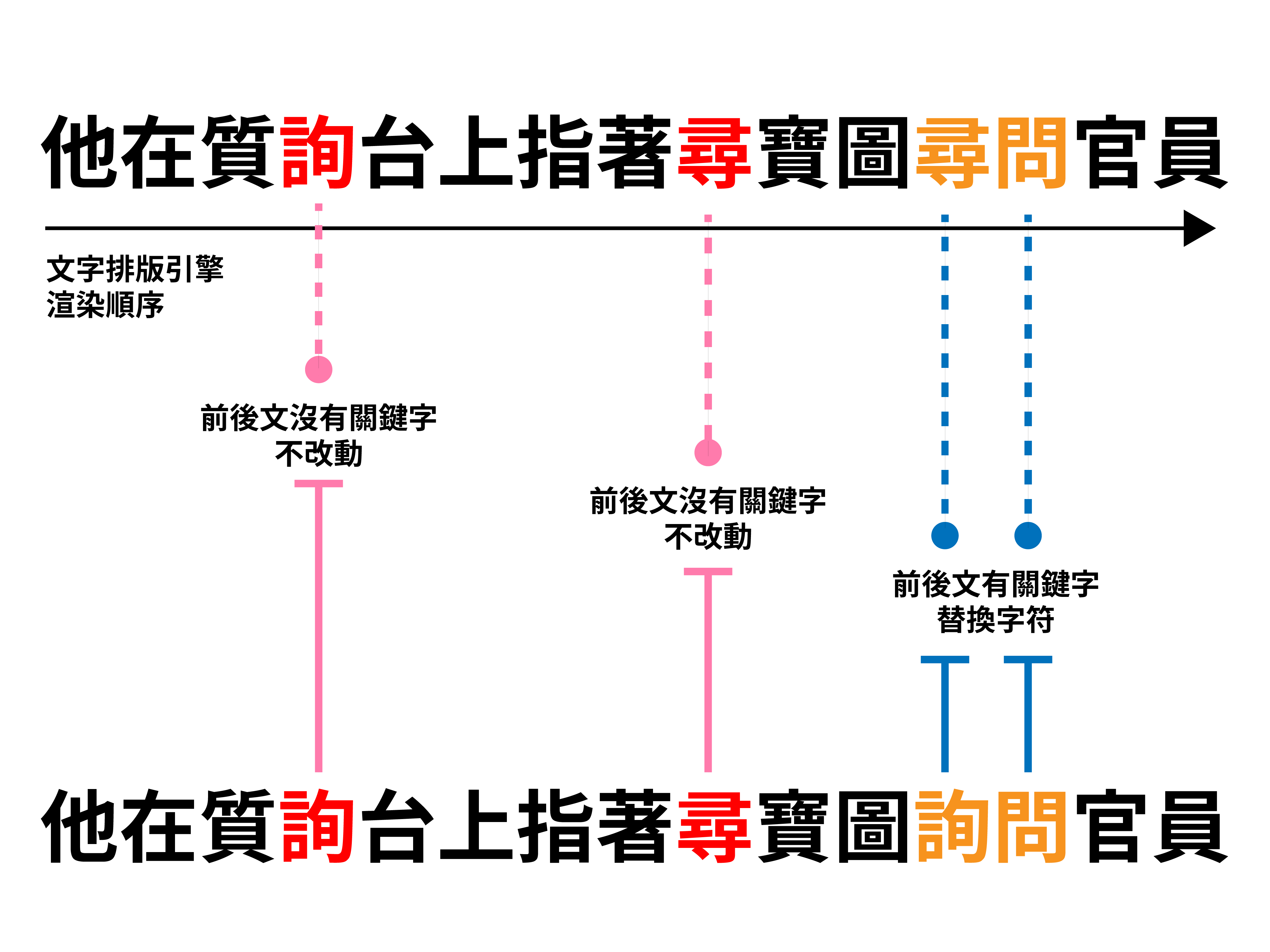 以 ㄒㄩㄣˊㄨㄣˋ 二字來說,正確的寫法應該是 詢問 二字,但常常會有使用者打成 尋問。此時,我們就可以透過 calt 特性,讓字型判斷當 尋 跟 問 出現在一起的時候,將前者的 尋 替換成 詢;而若兩者沒有放在一起的話,就保持原狀就好。