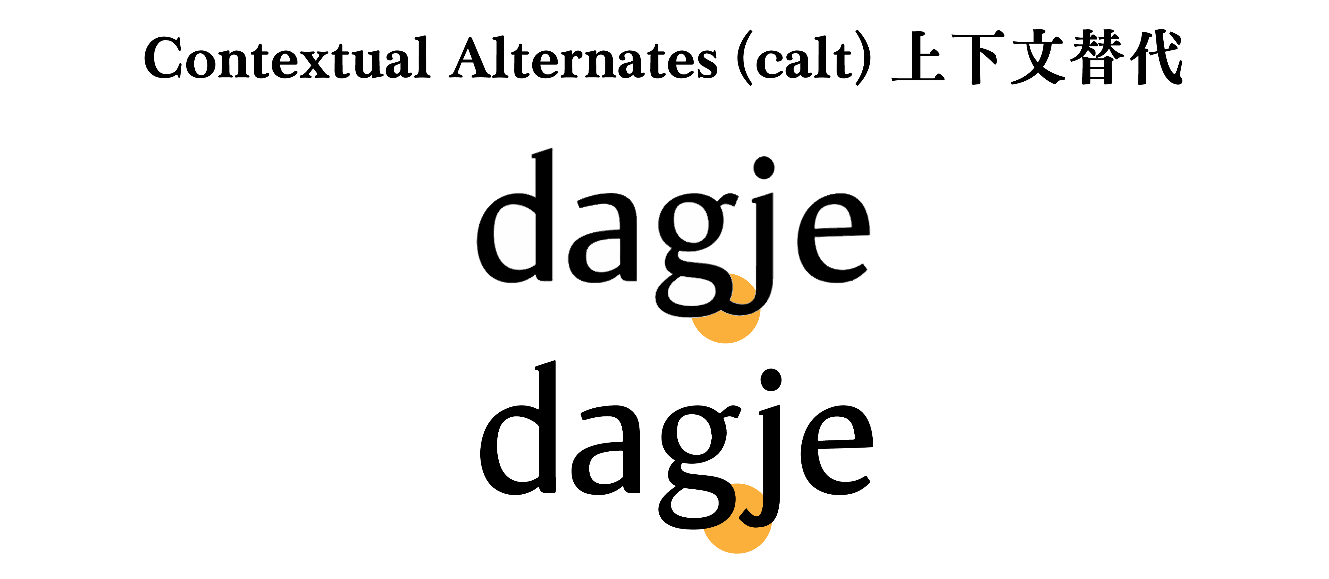 上下文替代,是會依照該字符的上下文語境(context)去判斷是否需要替換。換句話說,此 feature 是存在邏輯判斷的。舉例來說,像是 j、q、g、y 這些擁有下降部(descender)的拉丁字母,如果同時出現在一起的話,下面可能就會擠在一起,可是和其他字符並排時又看起來好好的。