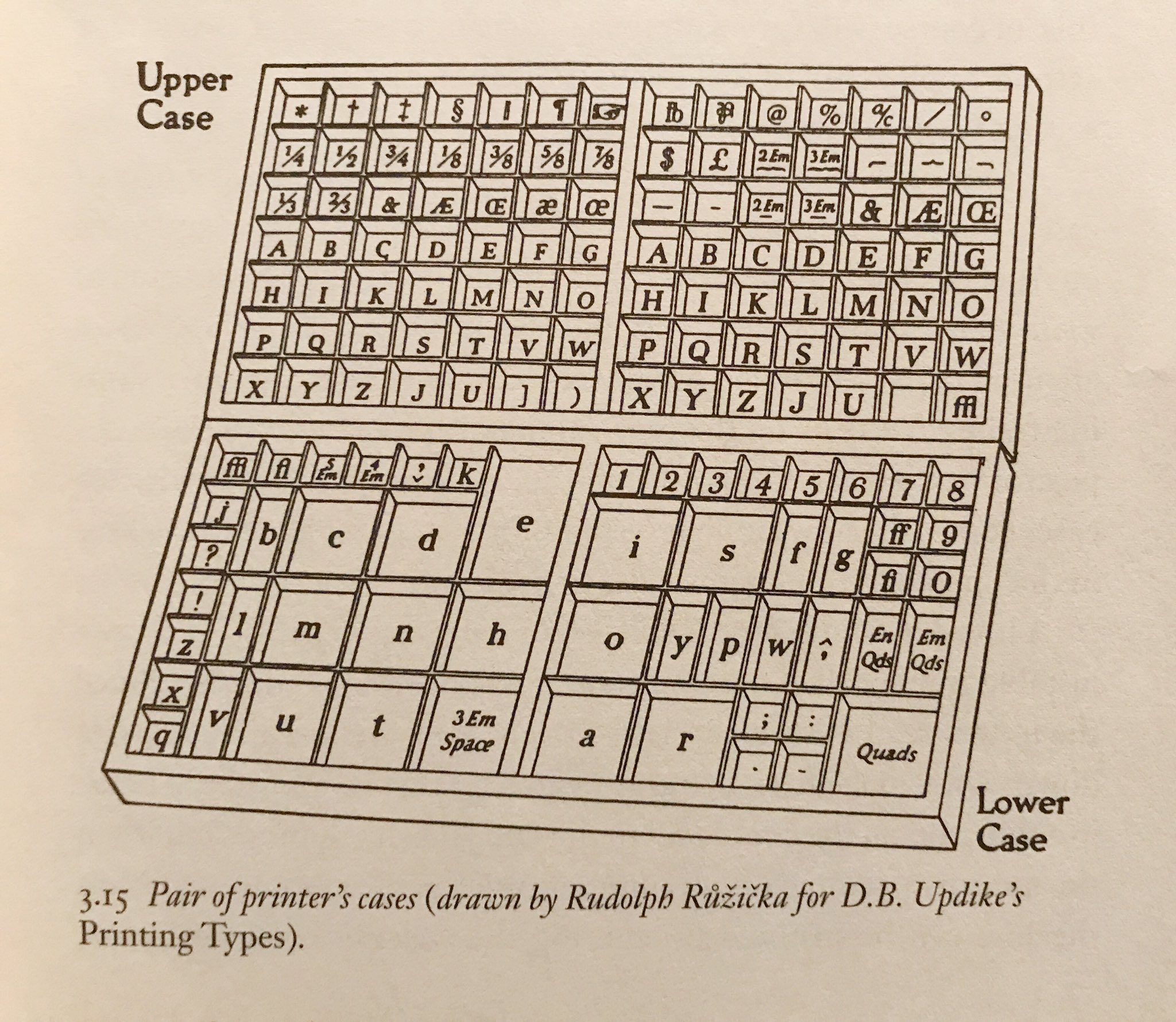 到了活字時代,因為小寫使用頻率比大寫還要高,因此會被放在鉛字盤靠近下面的地方,方便檢字員快速找到需要的字母,因此被稱作 lowercase;相對的,因為大寫字模會被放在上層、離檢字員較遠的地方,因此才被稱作 uppercase。