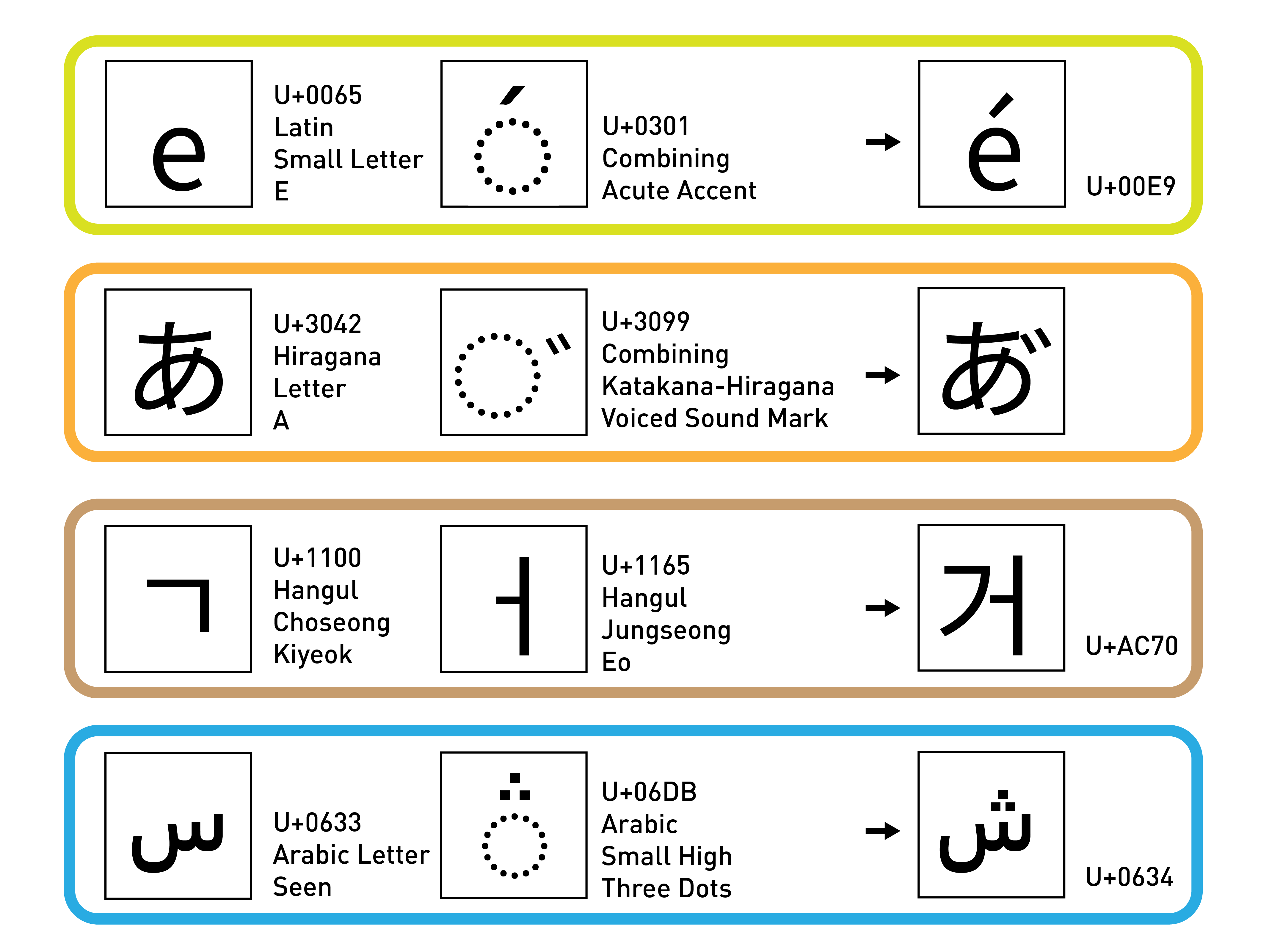 不過,Unicode 很快就意識到,收錄所有變音字母的想法實在太過天真,畢竟變音符號這種在任合字母上都可以加上去的東西,有時候還不僅限於只加一個,有需要的話可以無限的上疊,產出的組合可以説成千上萬——光是一個 a,就 至少 可以組出 áăắặằẳẵǎâấậầẩẫäạàảāąåǻã 共 23 種變化——甚至,你也可以在漢字上面標記變音字母,雖然沒有人會這樣,但也沒規定不行這樣做。