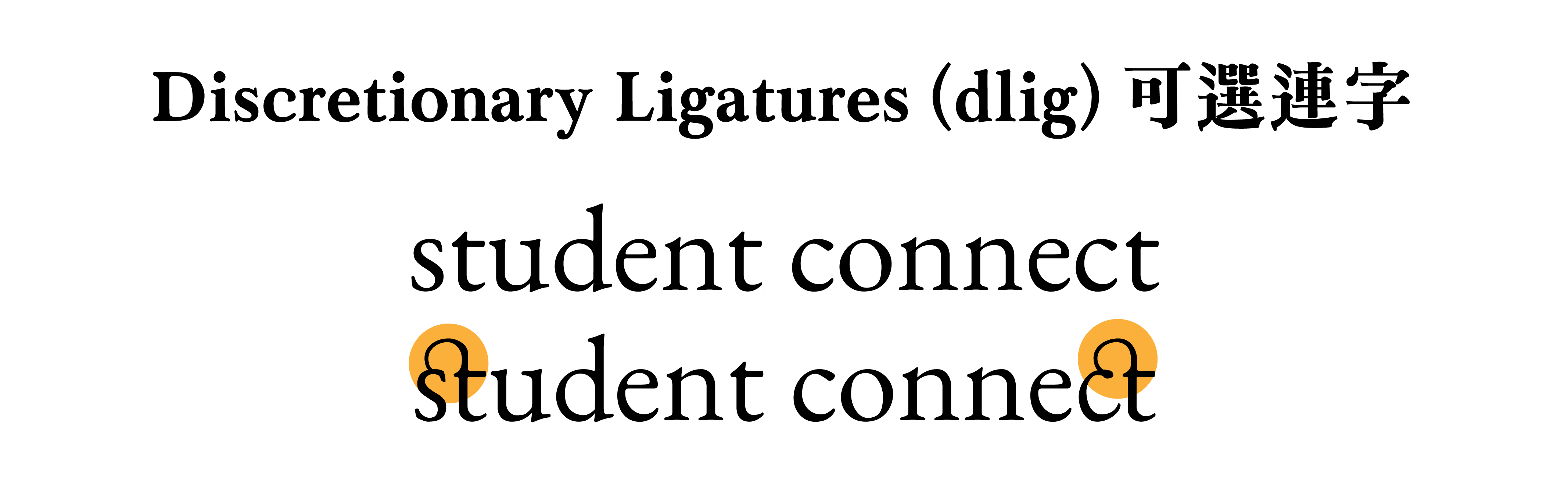 較著名的 dlig 如 c_k、c_t、s_t 等字符對。這些字符對的歷史其實已經相當悠久,當時的設計師想要刻意模仿沾水筆的書寫,而將兩個字符加上連筆。不過,如果不熟悉傳統歐文書法的人可能會「誤判」這些連字,在某種程度上造成閱讀的困難,因此他們通常都是「可選」的,要使用的話必須要考慮目標受眾。