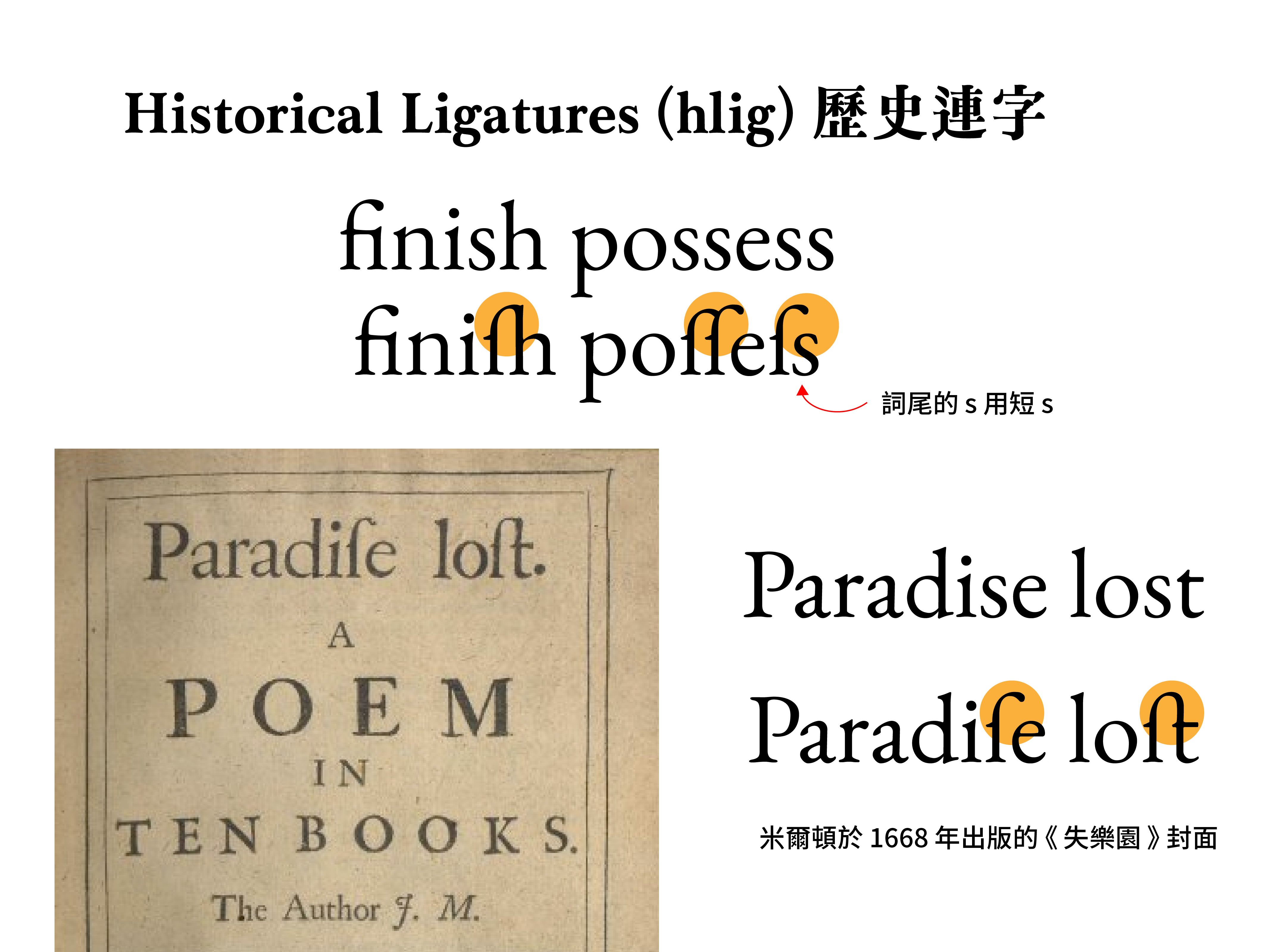 歷史性連字主要是用來紀錄古籍或經典裡面的連字字符。如果想讓設計的字型更有復古的感覺,可以嘗試設計 hlig。