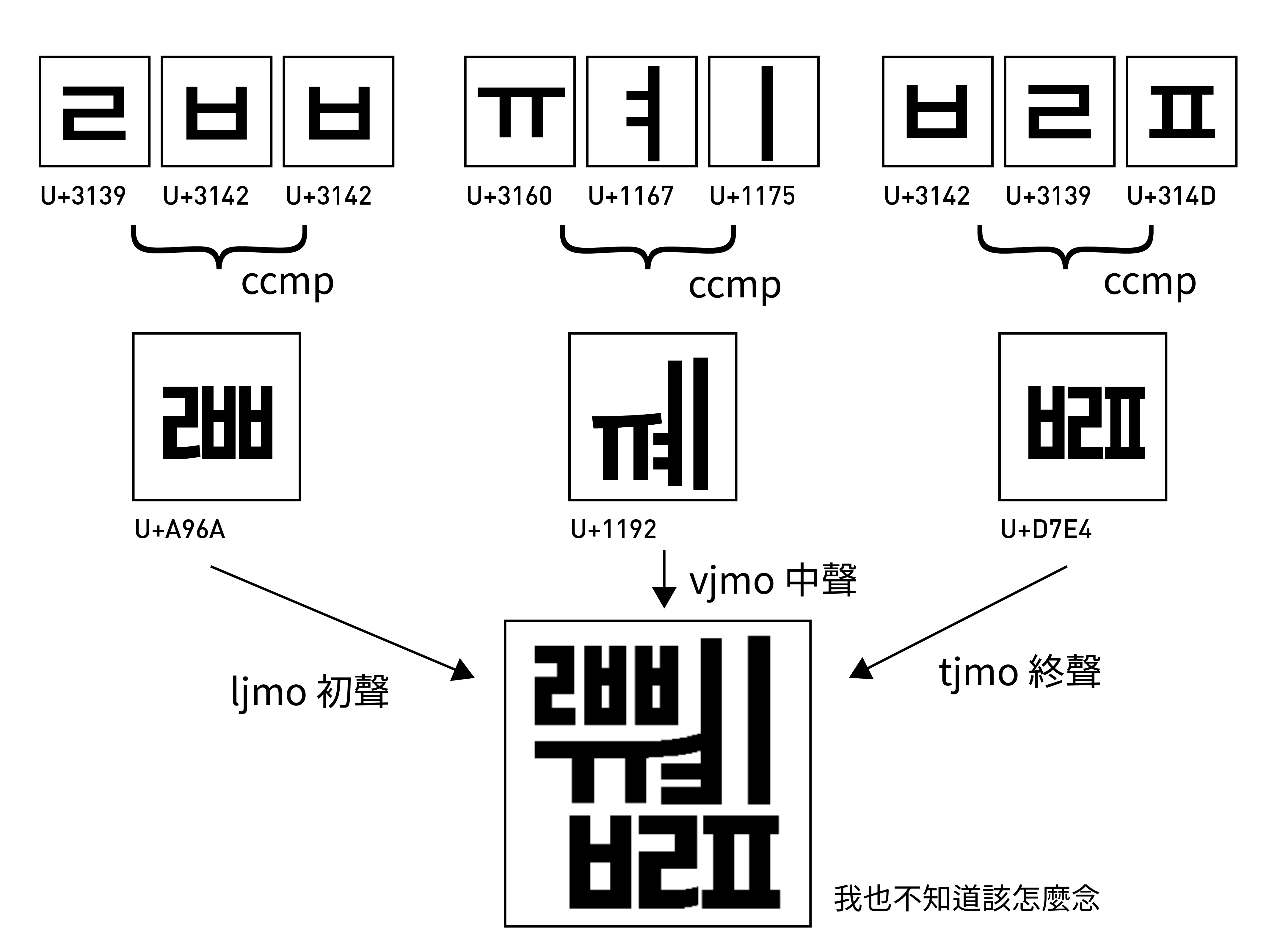 面對這 11,172 的組合,如果使用 ccmp 實現組合,便只需要佔用 19+21+28=68 個碼位就好,那為何 Unicode 還是為每個可能出現的韓文都分配了單獨的碼位?雖然有謎之八卦指出是韓國的施壓,但我想還是為了配合當初韓國廠商施行已久的 KS X 1001 編碼、以及當年 OpenType 支援度還未普及的關係。