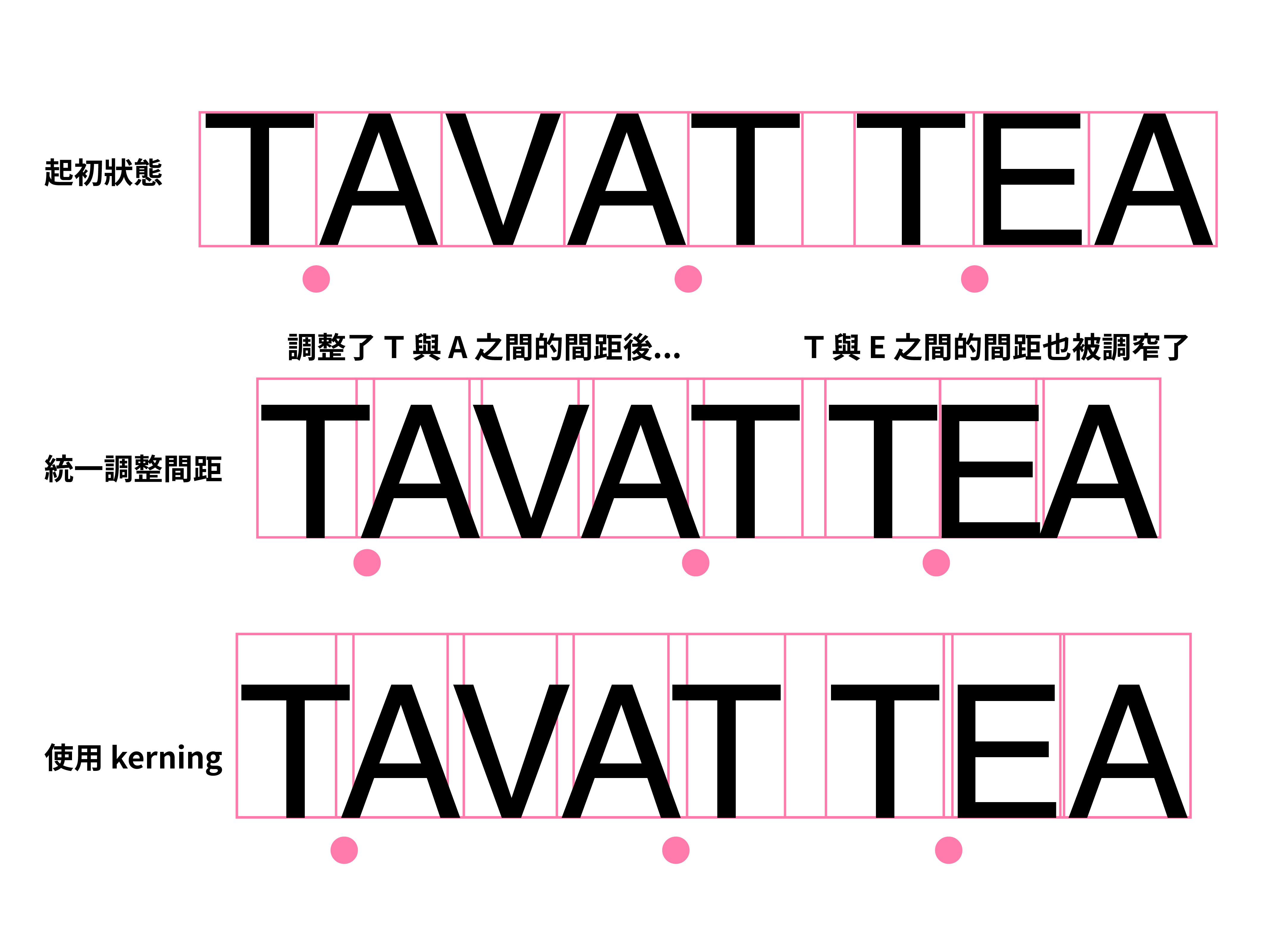 然而,即使我們已經調整了左右間距,把字符排在一起的時候,偶爾還是會有一些彆扭的空間,如下面的 TAVAT 字樣,每個字中間都好像被切開了,完全沒有一個詞的感覺。