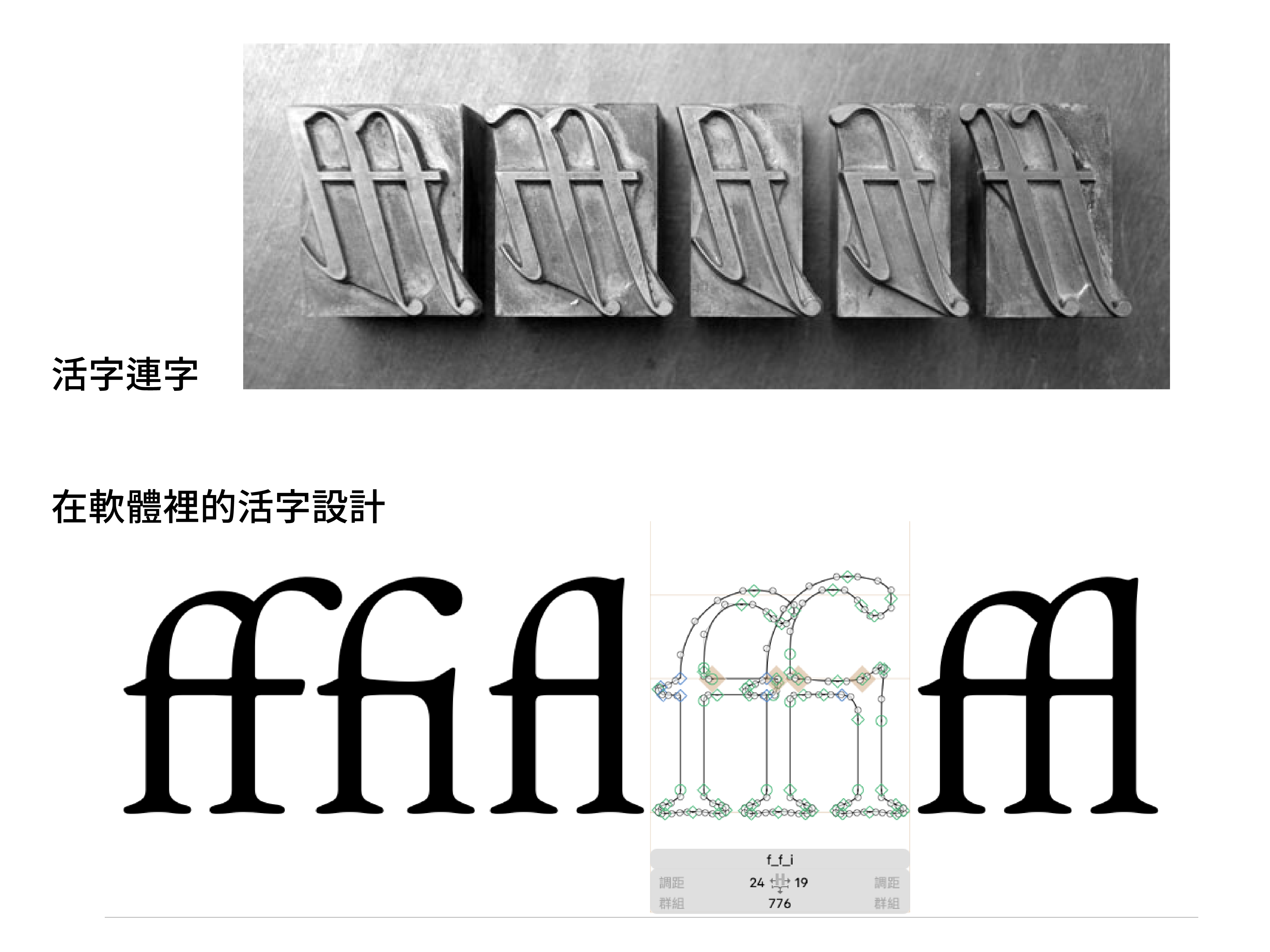 在目前的字型設計軟體中,kerning 的距離都可以分開來設計,讓字與字之間的曖昧距離更加自然。不過,受限於設計,有些字符對即使設定了 kerning,也會看起來怪怪的,此時,鑄字師會近一步鑄造一個「連起來」的字模,也就是連字(ligature)。