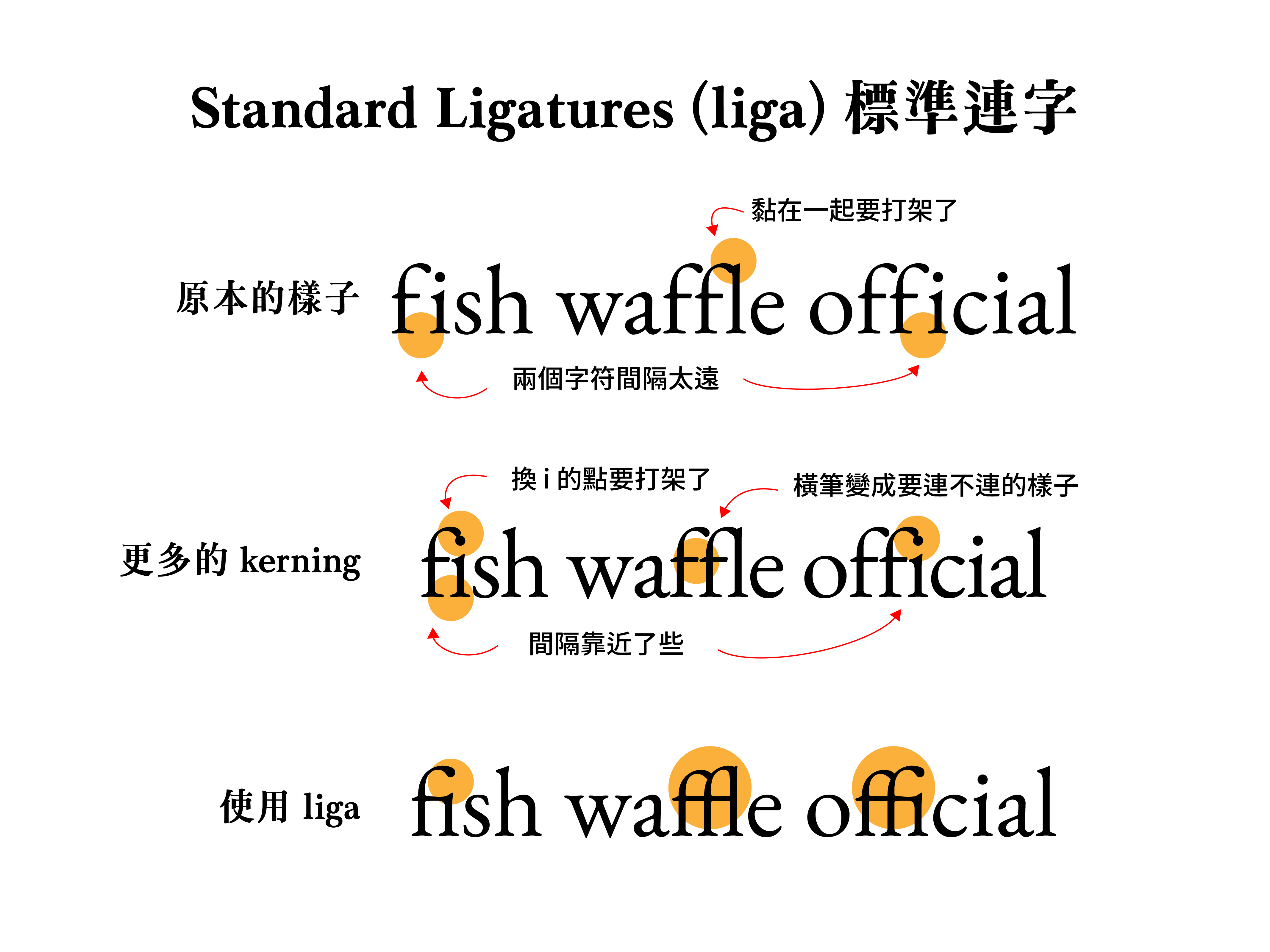 為了使排版更美觀,歐文字型幾乎都會製作 liga 的字符,而在大多數的文書軟體與瀏覽器中,標準連字預設都是開啟的。但如果想要手動調用的話,還是可以透過以下 css 啟用: