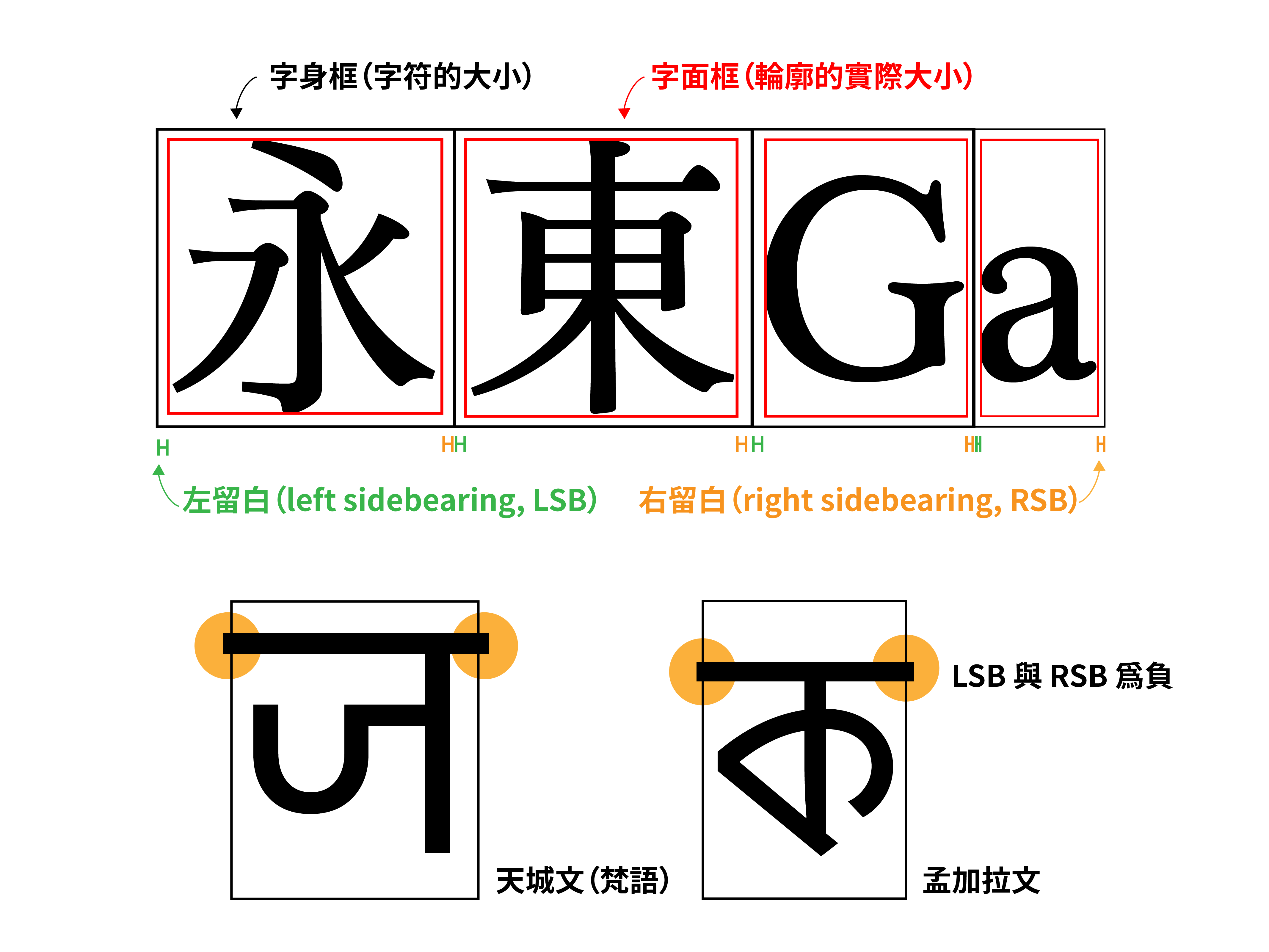我們將字型輪廓本身的外接矩形稱作「字面框」,以漢字來說,字身框的大小注定會比字面框來得大。而字面框與字身框在左右留下的間距,便被稱作左留白(left sidebearing, LSB)與右留白(right sidebearing, RSB)。