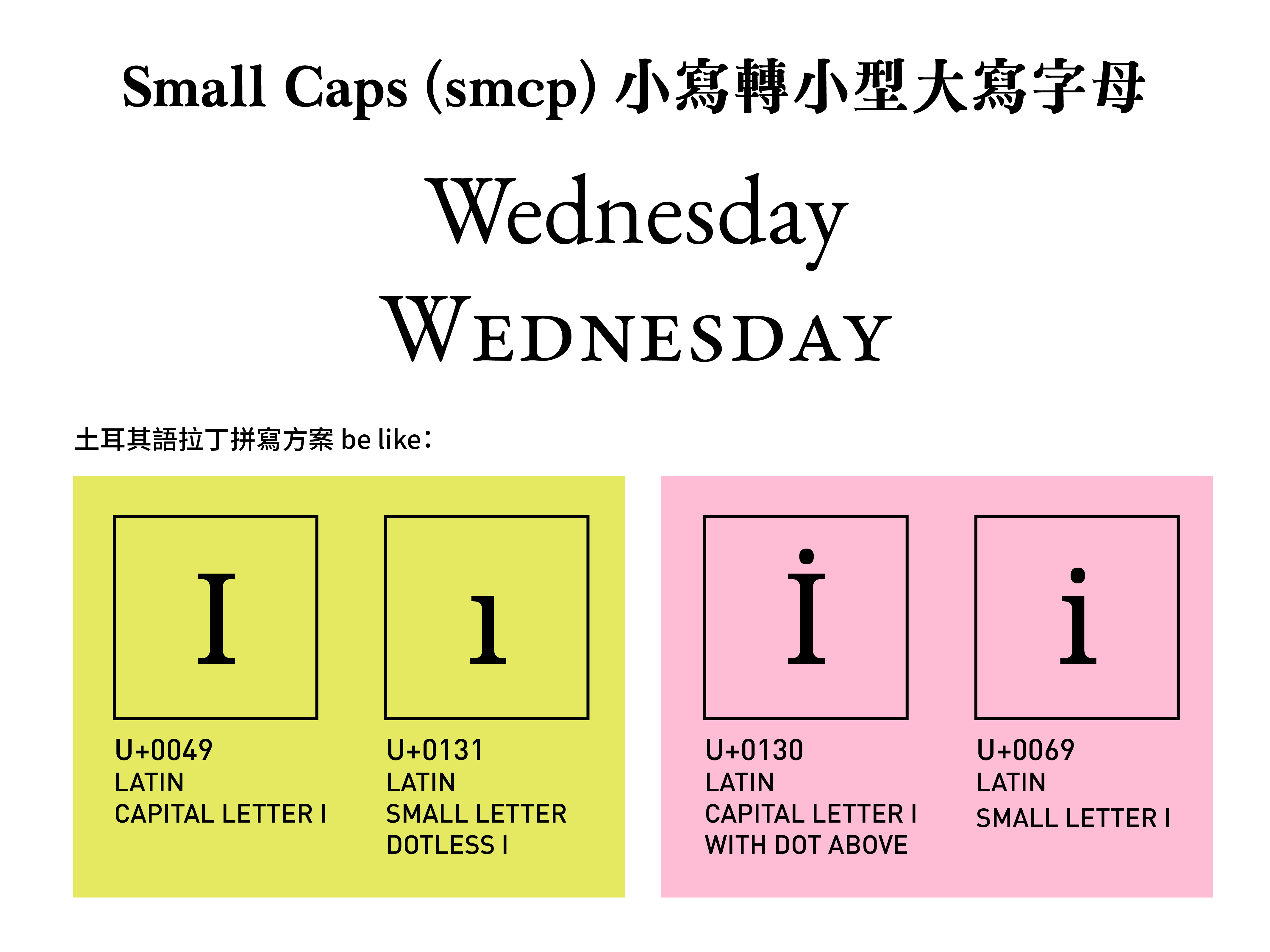 拉丁字母的大小寫轉換大家應該都很熟悉了,但仍然要格外注意字型的使用客群。舉例來説,在英文裡 i(U+0069)和 I(U+0049)是一組的,但在供土耳其語使用的土耳其拉丁文字裡,大寫 I (U+0049)的小寫是 ı(U+0131,上面沒有一點),而大家常以為的 i(U+0069) 的大寫其實是 İ(U+0130,上面有一點)。也因為這樣,所以在土耳其文中,f_i 連字應該禁用。