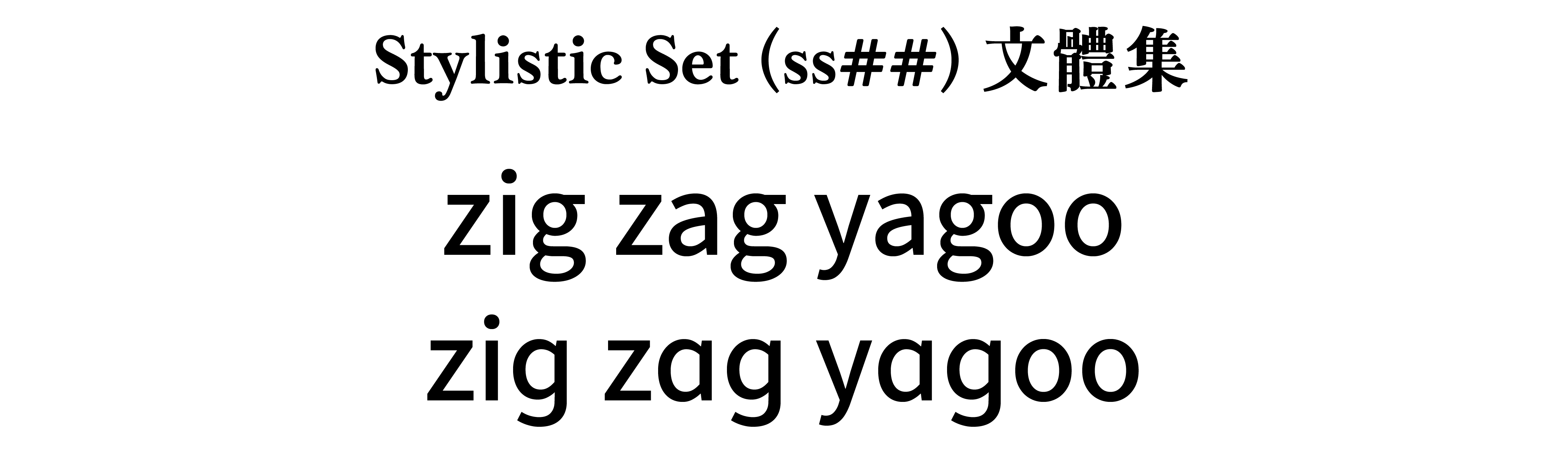 OpenType 定義了 ss## 的文體集(可以想成是同一個字、但不同風格的集合),在一個字型檔案裡,每個字符最多可以放入 21 種不同的造型(本體 + ss01 ~ ss20)。所以,其實你可以把襯線造型跟非襯線造型打包在同一個字型檔案裡面——只是通常不會有人這麼做。