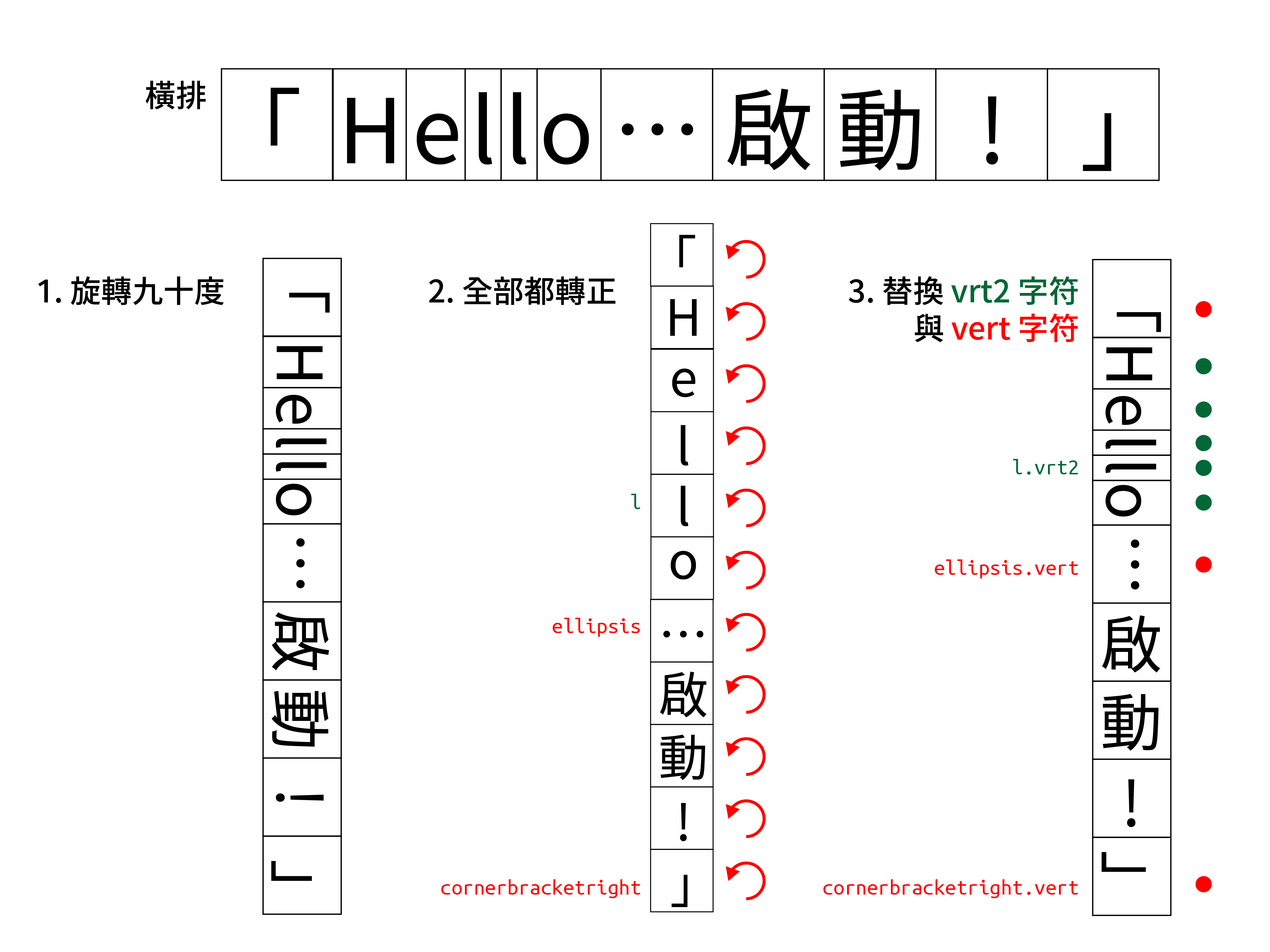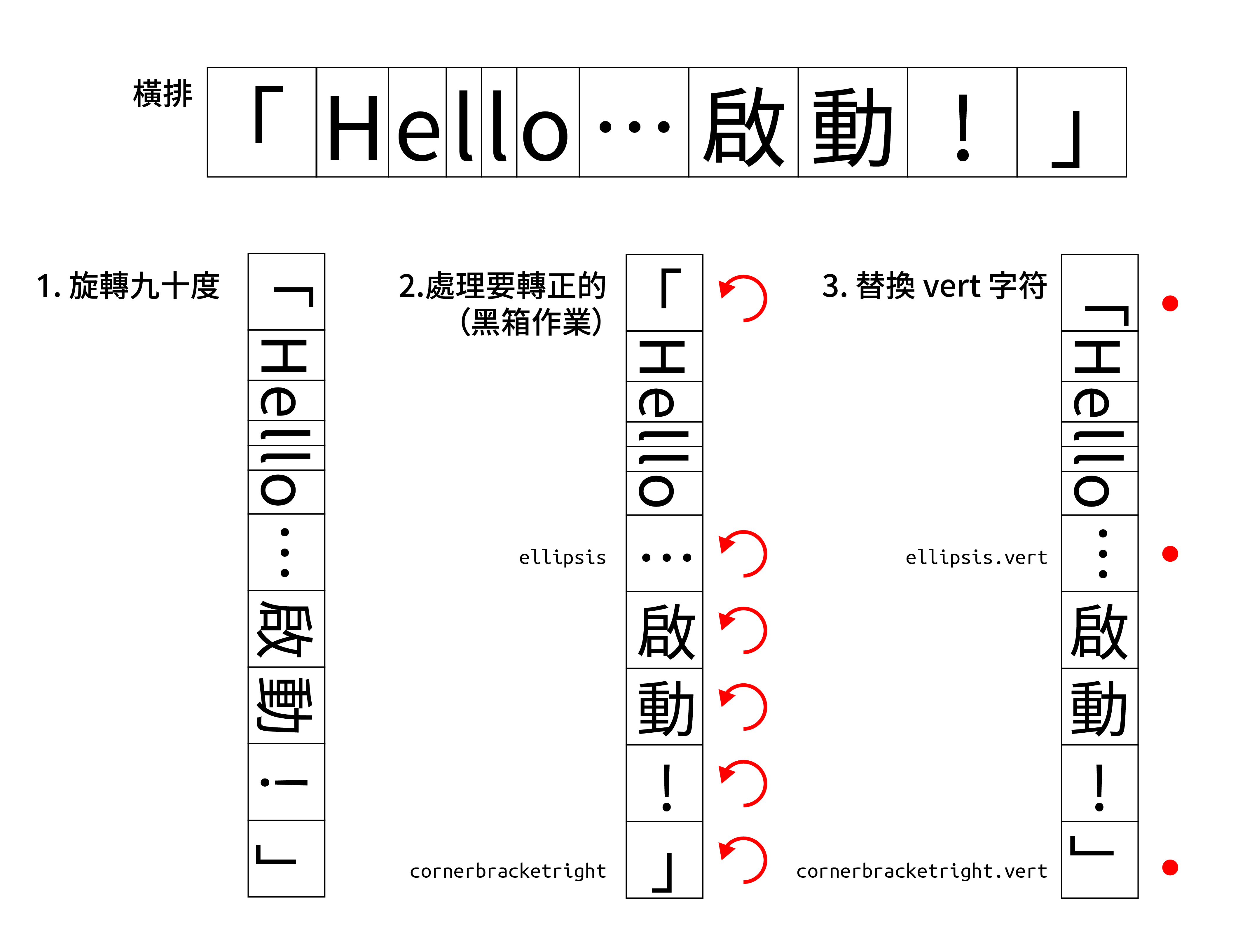 在文字從橫排改成豎排時,會先把所有的文字都旋轉 90 度,接著分辨哪些是需要轉正的(例如漢字、假名、全形字符),再將其旋轉回來。最後,透過 vert 表,將表內給定的標點符號替換成 vert 版。