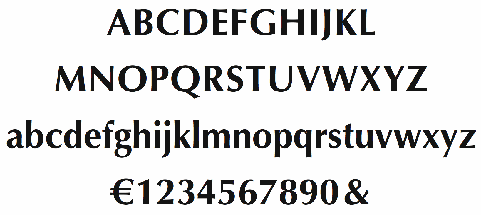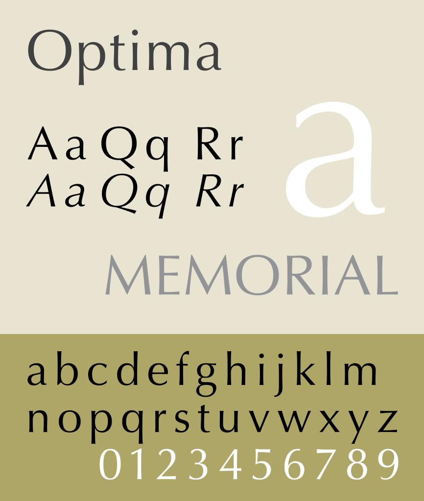 受那塊聖殿裡的石碑碑文啟發, Optima 的大寫繼承自西元四世紀左右的「羅馬方塊大寫字母(Roman square capitals)」設計,其特徵包含尖銳的轉角、主幹呈直線卻又在末端帶有曲線的柔和,以及經過調整的羅馬比例。