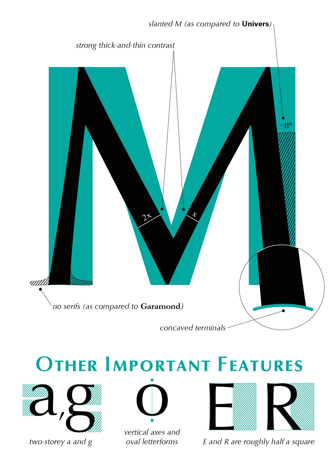如其大寫字母 S 有點向右傾斜,E、F、L 約只佔了其他字母的一半空間、以及向外展開的 M 等;而小寫的部分也繼承舊時代的風格,如小寫字母 a 和 g 皆採用了和當時流行(1950 年代正是國際主義印刷風格大為風行的時候)背道而馳的雙層結構。