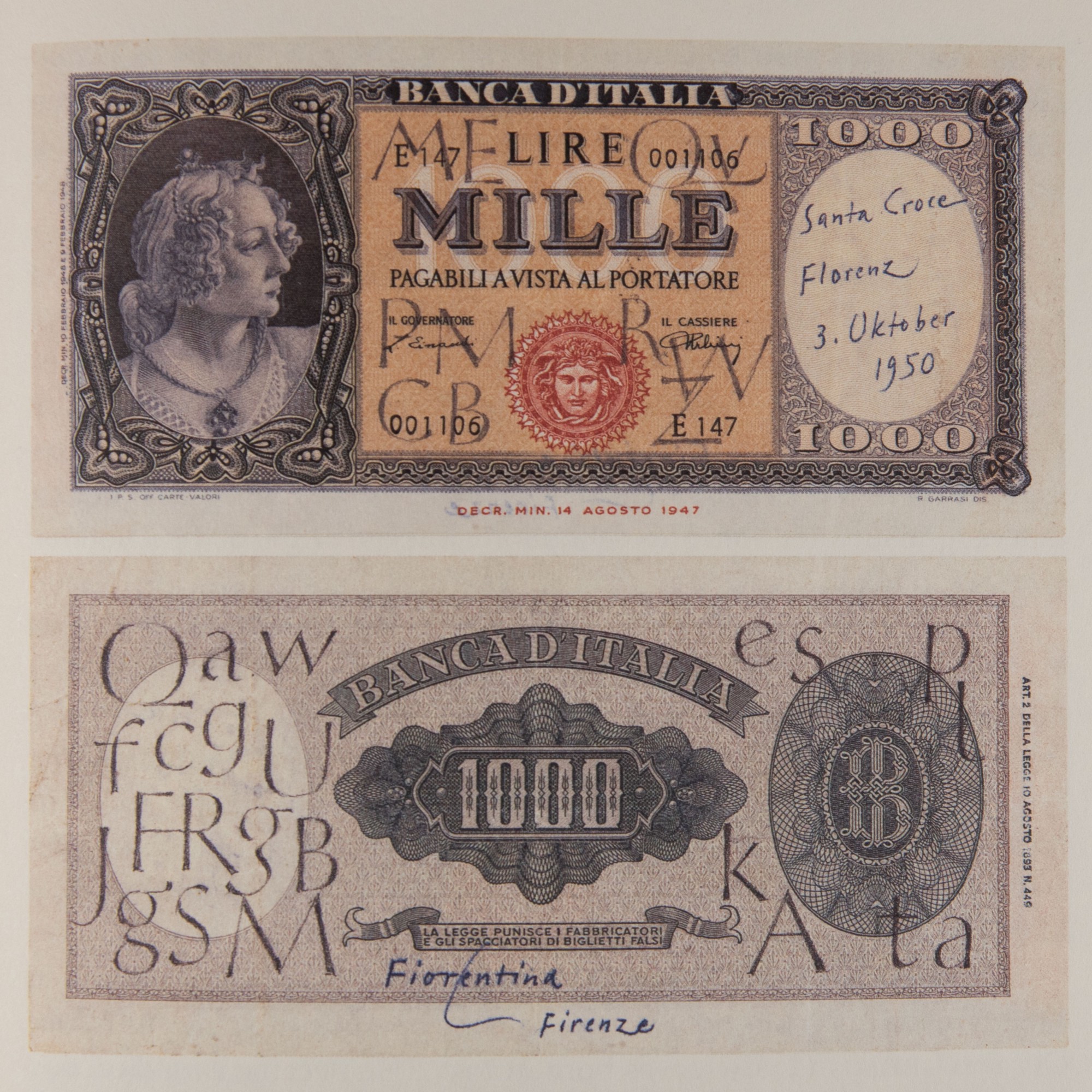 盯著這幾行字,Zapf 發現自己竟如此地深深著迷,他開始構想下一個作品。因為身上沒有多餘的白紙,他索性拿出口袋的 1000 里拉鈔票,在上面繪製了日後被稱作 Optima 的第一份草圖。