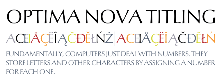 此外,小林章還另外以 Zapf 的手寫書法作品為樣本,以 Optima 的風格另外設計了 Optima nova Titling,該字體只有大寫、且包含了大量的連字處理。和曲線已被平順化的 Optima 相比, Optima nova Titling 更接近人為書寫的樣子,在轉角的處理更為柔和,像極了墨水在紙張上暈開的樣子。