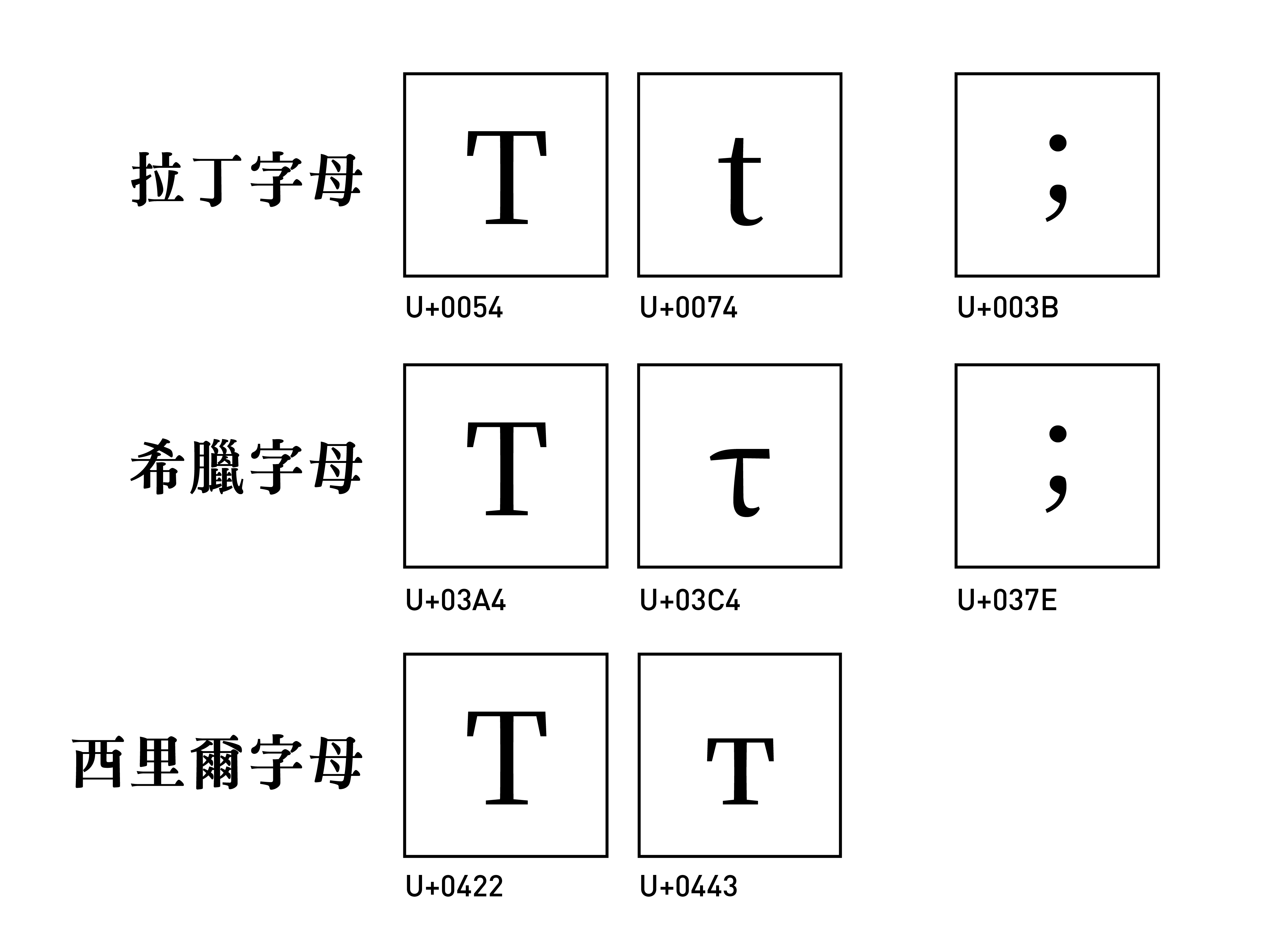 反之,只要是不同來源的字母,即使長得有多像,甚至是看起來一模一樣,都應該被分開來收錄。因此拉丁字母的 T (U+0054) 、希臘字母的 Τ (U+03A4)、西里爾字母的 Т (U+0422) 理所當然的被分配到了不同的碼位。而英文的分號 ; (U+003B) 雖然和希臘文的問號 ; (U+037E) 長得一模一樣,也會被分別收錄。