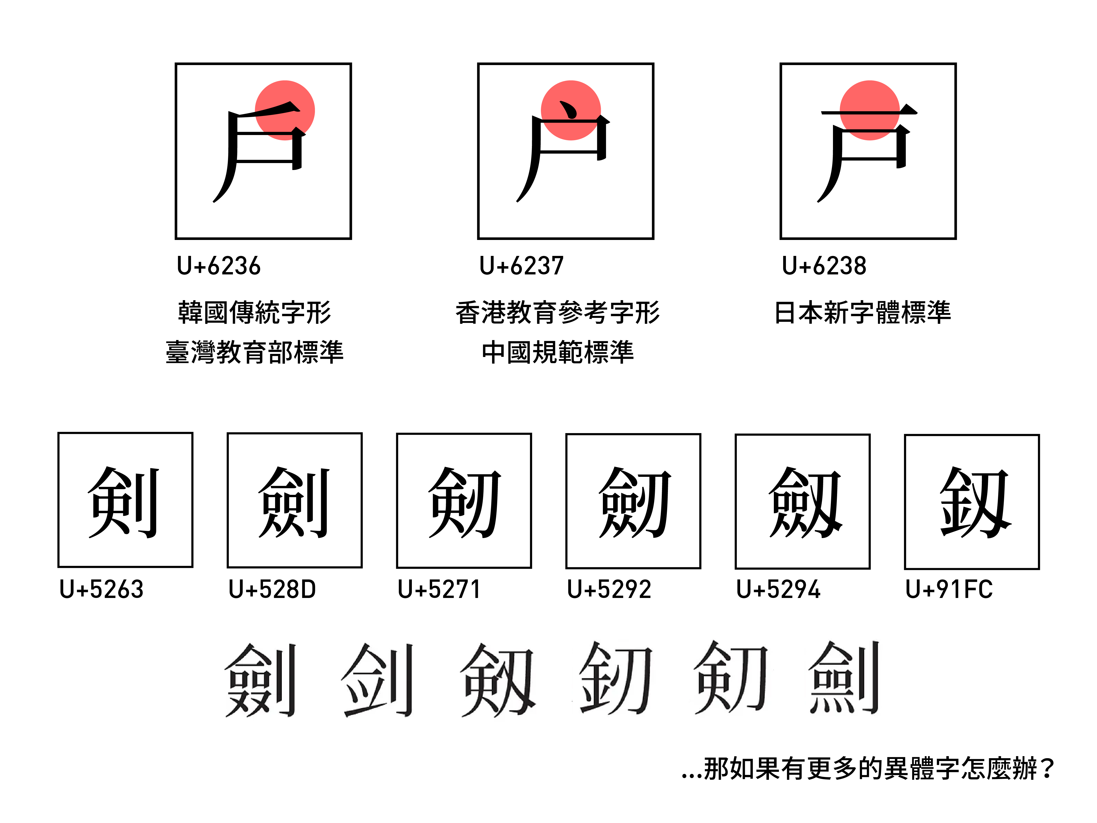 因此,後來的 Unicode 在 CJK 一事上放棄了字集分離收錄規則,額外訂定出表意文字認同原則(Han Unification Rule),透過「只針對字符本身,而不針對字長怎樣」的邏輯,就 應該 可以把上面的 戶、户、戸 合併成一個碼位處理,改由字型來區分字形。