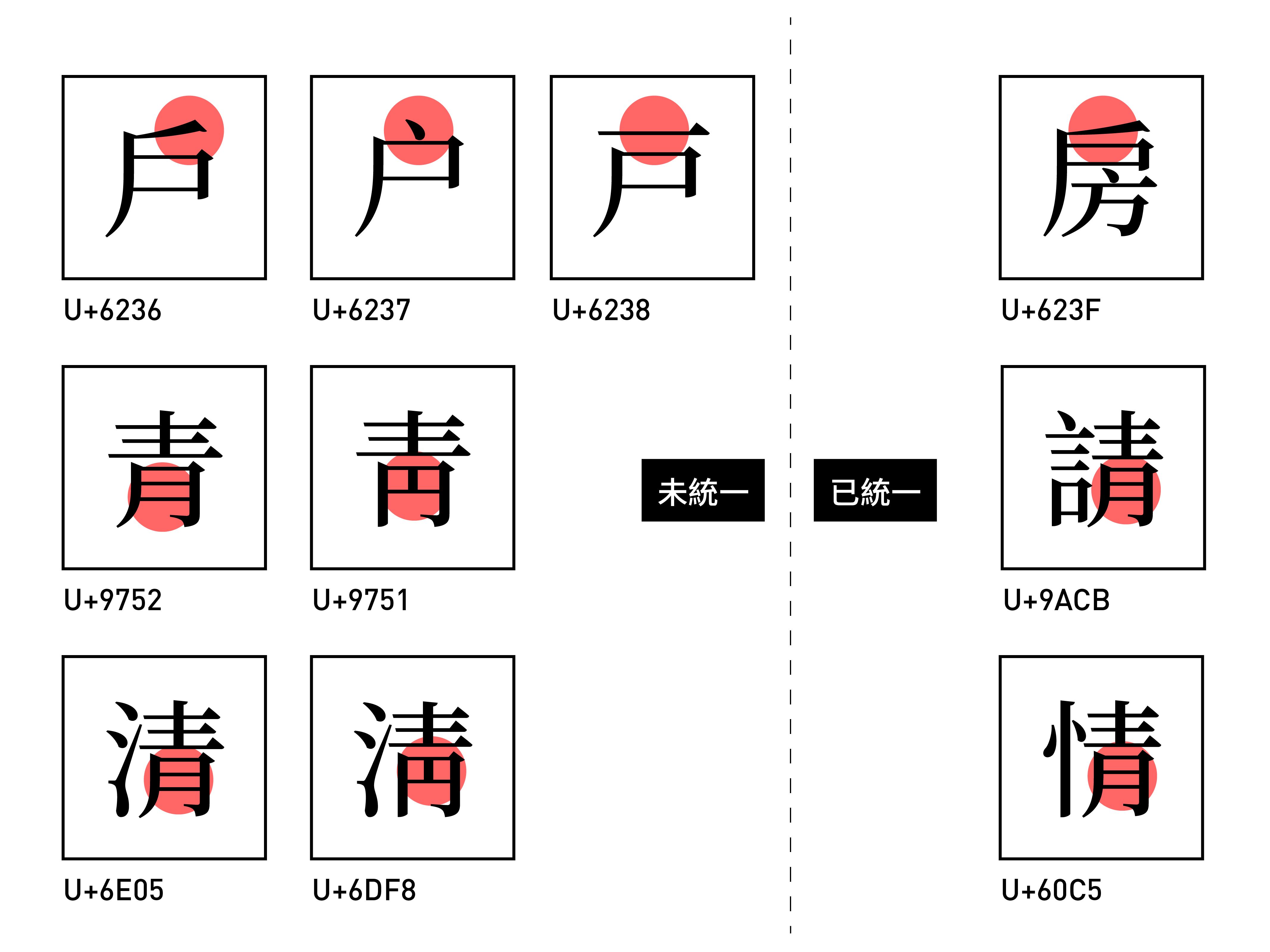 舉例來説,根據 Unicode 的 Stability 原則,已經被分配的碼位無法變動,因此上面提到的 戶、户、戸 碼位依舊,但像 房 這個字就被統一到一個碼位(U+623F)。青(U+9752)和 靑(U+9751)、淸(U+6DF8)和 清(U+6E05) 被分成兩個碼位收錄,但 請(U+8ACB)跟 情(U+60C5) 卻被合併在一起了!