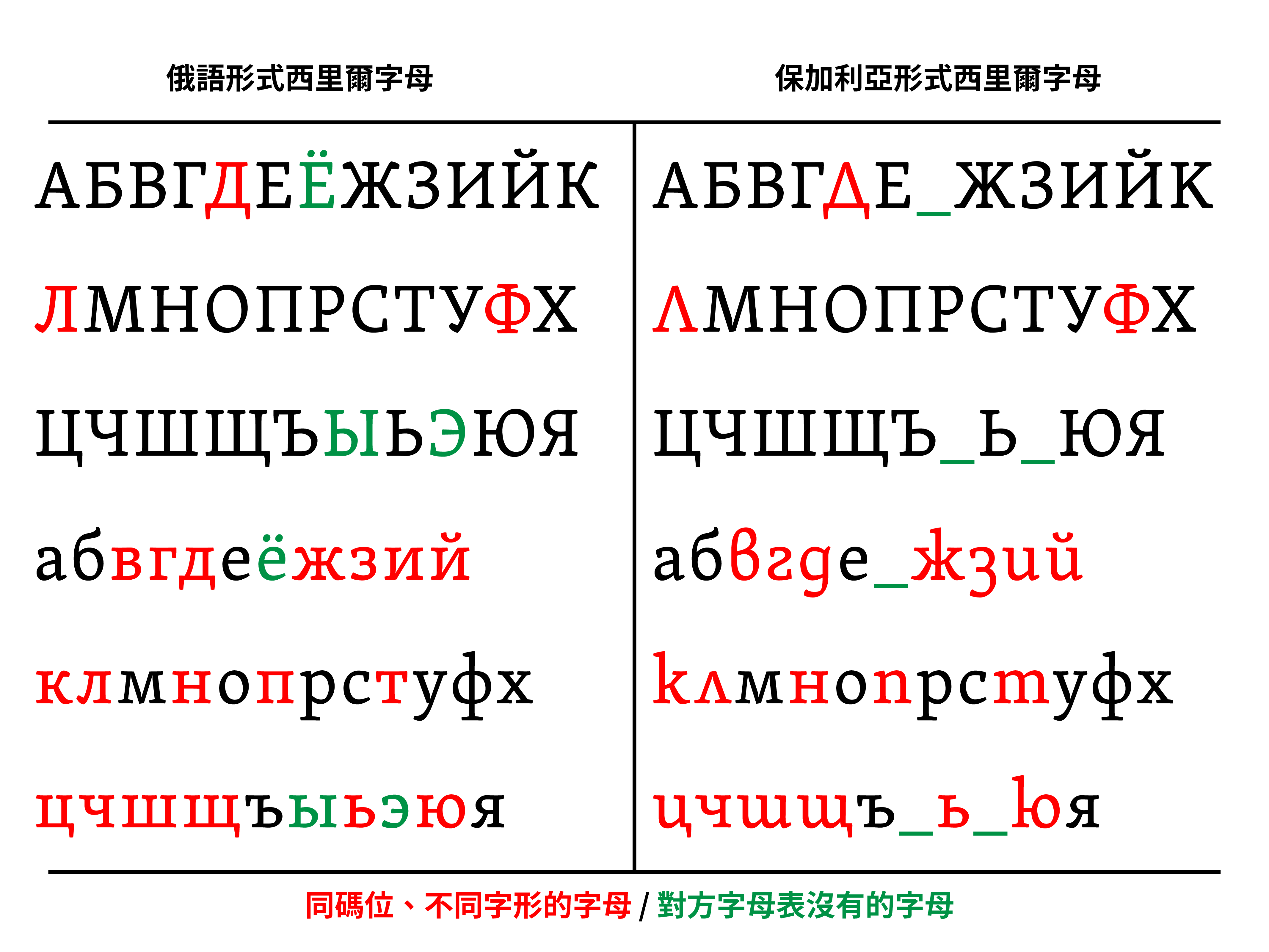 保加利亞民間一直有在倡議使用保加利亞形式的西里爾字母,而最近俄羅斯和烏克蘭的抓馬,讓文字也牽扯到了民族情緒,變成了一個更複雜的問題。